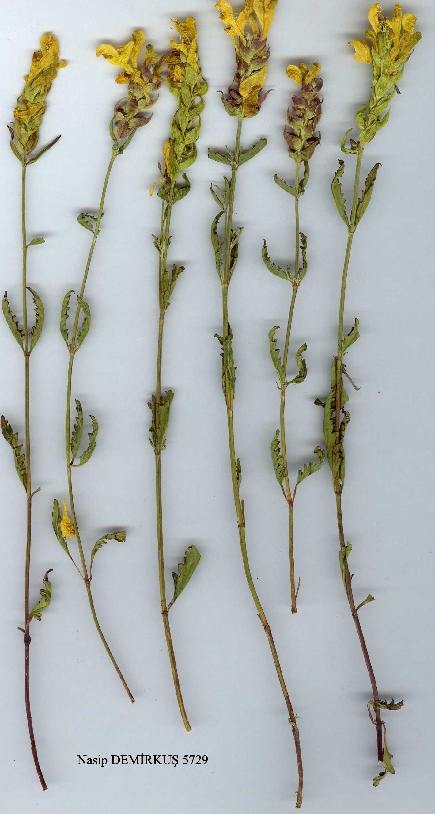S. orientalis L., Sp. PI. 598 (1753). i0 ' ~'yJ^J A very variable suffrutescent perennial herb, usually repent at base. Stems 5-45 cm, obscurely tetragonal. Leaves distinctly petiolate, lamina ovate-elliptic to linear, 5-30 mm, usually obtuse, cuneate or attenuate (rarely truncate) at base, (with rare exceptions) 1.5-2 x as long as broad, weakly crenate to incised-pinnatifid or pectinate-pinnatifid, glabrous to densely canescent-tcmentose, often markedly discolorous. Inflorescence a terminal spike with tetragonal ranks of flowers (not secund), usually dense with ± imbricate bracts; bracts very variable in size and shape but often either pale greenish or deeply purple-tinged, sessile. Corolla 20-32 mm, usually yellow, sometimes reddish-spotted or with red upper or lower lip or entirely pink, bright red, brick-red or purplish, ± pubescent. Nutlets oblong, tomentellous. A polymorphic complex extending from Spain and N.W. Africa to Sinkiang. The following 16 subspecies have been recognised mainly by a combination of characters of habit, height and mode of branching of stem, shape and degree of incision of leaves, leaf indumentum, size and shape of bracts and corolla colour. Where appropriate, the distribution of the subspecies within Turkey has been cited in a parenthesis in the key. Short descriptions are given as a further aid to correct identification. Some material cannot be accommodated within the subspecies as presently delimited, and examples of such specimens have been cited which fall outside the range of measurements etc. given in the descriptions. The existence of such morphological intermediates prompted me to adopt a broad species concept in this group. 1. Cauline leaves at least 4 x as long as broad (Inner Anatolia) m. subsp. santolinoides 1. Cauline leaves less than 4 x as long as broad 2. Leaves pinnatifid, divided at least to midway to midrib 3. Lower bracts pinnatifid to dentate; stems to 25 cm tall (S.E. Anatolia) j. subsp. pichleri 3. Lower bracts entire, rarely lowermost pair with 1-2 teeth; stems not exceeding 20 cm tall 4. Leaves pectinately lobed with narrow linear segments, divided almost to midrib, strongly discolorous, greenish above, whitish beneath (N.E. Anatolia) c. subsp. sosnowskyi 4. Leaves divided to distinctly short of midrib, lobes ± revolute, con-colorous or weakly discolorous, greenish above and beneath (widespread) h. subsp. pinnatifida 2. Leaves serrate, crenate or crenately lobed, divided to less than half-way to midrib 5. Lamina of median cauline leaves not more than 8 mm (rarely more); plant prostrate, mat-forming 6. Margins of leaves subacutely serrate; calyx densely sericeous (S.E. Anatolia) k. subsp. porphyrostegia 6. Margins of leaves obtusely lobed; calyx not sericeous 7. Plant greyish-incanous; margins of leaves often strongly recurved; corolla dusky crimson with yellow lower lip, rarely yellow (medium altitudes) g. subsp. pectinata 7. Plant ± greenish, not incanous; margins of leaves not strongly recurved; corolla yellow, lower lip sometimes reddish-tinged (widespread at high altitudes) i. subsp. alpina 5. Lamina of cauline leaves more than 8 mm (except uppermost); plant prostrate to erect, mat-forming or not 8. Leaves markedly discolorous, silvery-tomentose beneath (N.E. Anatolia) b. subsp. orientalis 8. Leaves concolorous or somewhat discolorous, not silvery beneath 9. Stem 20-45 cm, erect; bracts lanceolate to ovate, ± falcately curved upwards 10. Inflorescence lax; lamina lanceolate to oblong, 3-4 x as long as broad (E. Anatolia) n. subsp. sintenisii 10. Inflorescence dense; leaves 1.5-2.5 x as long as broad 11. Stem 20-35 cm, usually branched at base; leaves sparsely tomen-tellous above and beneath, margins shallowly dentate; bracts concave, not keeled (S.E. Anatolia) p. subsp. bornmuelleri 11. Stem 30-42 cm, usually branched in upper third; leaves densely tomentose to canescent beneath, margins crenate; bracts keeled (E. Anatolia: Mesopotamia) o. subsp. haussknechtii 9. Stem to 20 cm, prostrate or ascending; bracts broadly ovate to orbicular, not falcately curved upwards 12. Leaves dimorphic, lowermost linear-oblong with revolute crenat-ions, densely greyish-hairy, cauline triangular-ovate (S.W. Anatolia) 1. subsp. carica 12. Lowermost cauline leaves similar to the rest, not densely greyish-hairy 13. Leaves glabrous (mainly S.E. Anatolia) a. subsp. virens 13. Leaves ± puberulous to tomentellous at least beneath 14. Lower surface of leaves evenly hairy on and between veins 15. Leaves ± concolorous (mainly S.E. Anatolia) a. subsp. virens 15. Leaves discolorous (E. Anatolia, mainly Anti-Taurus) d. subsp. bicolor 14. Lower surface of leaves unevenly whitish-hairy, with distinctly fewer hairs on veins 16. Stems prostrate, 5-15 cm; petiole to 20 mm (Inner Anatolia) e. subsp. macrostegia 16. Stems ascending to erect, 10-20 cm; petiole 3-5 mm (E. Anatolia: Mesopotamia) f. subsp. cretacea subsp. santolinoides (Hausskn. ex Bornm.) Edmondson in Notes R.B.G. Edinb. 38:55 (1980). Syn: S. santolinoides Hausskn. ex Bornm. in Notizbl. Bot. Gart. Berlin 7(63):32 (1917)! Map 13. Prostrate, ascending or stiffly erect, stems 10-45 cm, simple or branched above, minutely papillate-tomentellous. Leaves shortly petiolate, lamina narrowly linear to linear-oblong, 13-25 x 4-6 mm, dark green and tomentose above, lanate beneath, margins crenate, ± strongly revolute. Inflorescence an oblong, lax spike; bracts lanceolate, greenish. Corolla yellow, 22-28 mm, glandular-hairy. Fl. 5-7. Montane grassland and loose slopes, on gypsum and sandstone, 500-1330 m. Lectotype (chosen here): Turkey B7 Erzincan: Bacharsuk ad Euphratem, in pascuis montosis gypsaceis, 9 v 1890, Sintenis 2216 (LD! W!). Inner Anatolia; scattered. B5 Nevşehir: Nevşehir to Ürgüp, nr Üçhisar, 1330 m, K. & E. Buttler 20073! B7 Erzincan: Hassanova nr Kuruçay, Sint. 1890:2938! C6 Gaziantep: Nizip, Belkistepe, 500 m, A. Baytop (ISTE 40074)! Endemic. Ir.-Tur. element. Related to subsp. pectina