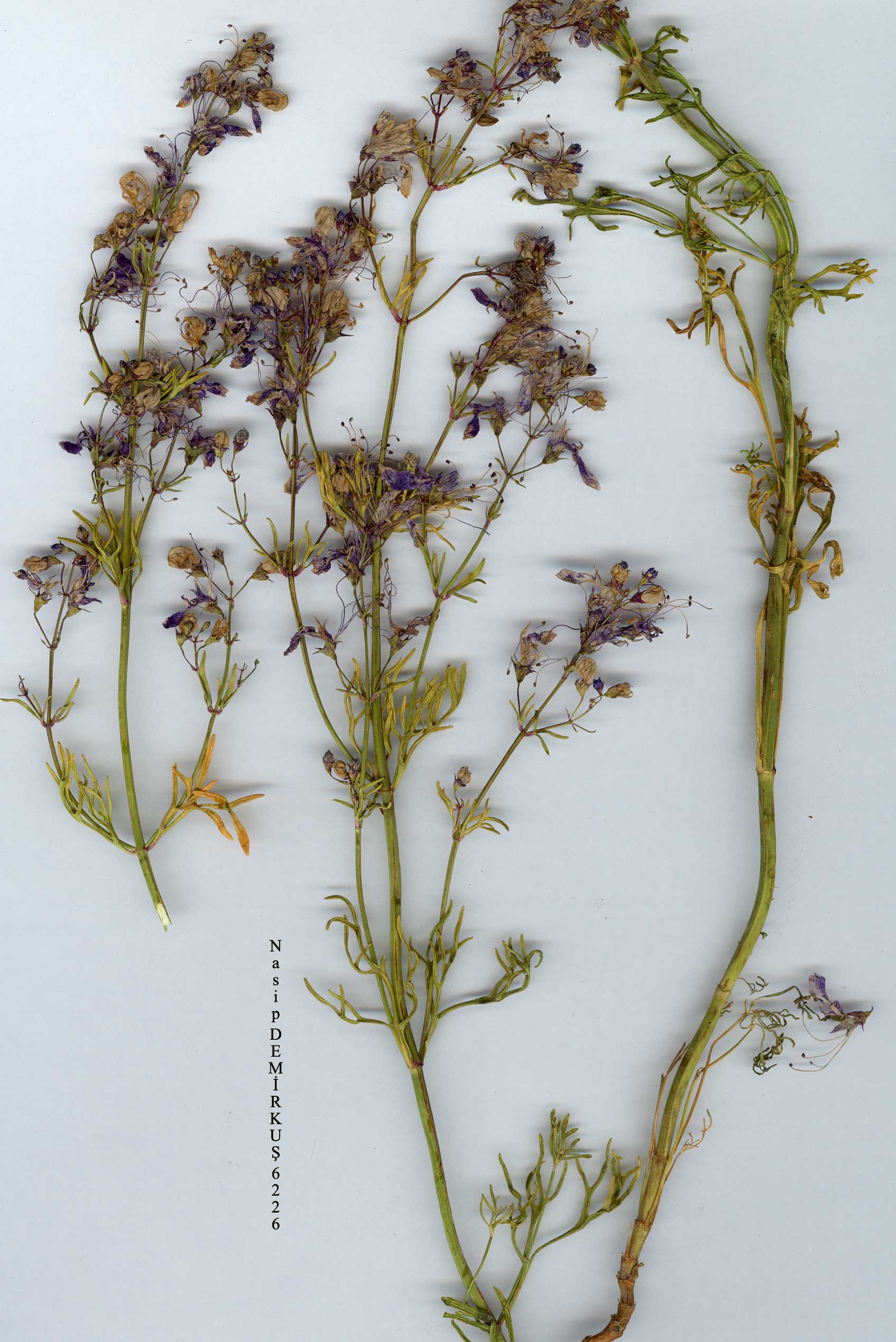 T. orientale L., Sp. Pl. 562(1753). Ic: Bot. Mag. 31: t. 1279(1810). Herbaceous perennial. Stems erect from a woody stock, 20-50 cm, glab-rous, puberulent or villous, hairs unicellular or multicellular. Leaves sub-sessile, ternately 2-3-pinnatisect into greenish linear lobes with revolute margins, glabrous or hairy. Inflorescence a thyrsoid panicle. Floral leaves dis-sected, shorter than the 1-3-flowered peduncles, pedicels longer than calyx. Calyx (3.5-)4-6(-7.5) mm, campanulate, teeth triangular-lanceolate, 1/3-2/3 as long as tube, straight-tipped. Corolla lilac-blue, usually 3 x calyx, occasionally glabrous; stamens about as long as lip. Fl. 6-9. A very variable species, divided here into 3 varieties according to indumentum. For this reason only specimens seen are cited. 1. Plant glabrous or subglabrous (stem often puberulous below) var. glabrescens 1. Plant conspicuously hairy 2. Stem puberulent, hairs (unicellular) sometimes increasing in length in inflorescence var. puberulens 2. Main stem shaggy with long multicellular (sometimes sparse) and short unicellular hairs var. orientale var. glabrescens Hausskn. ex Bornm. in Verh. Zool.-Bot. Ges. Wien 48 :624 (1898). Syn: T. eginense Freyn in Bull. Herb. Boiss. ser. 2, 1:281 (1901); T. orientale L. var. subglabrum Freyn, op. cit. 282 (1901);T. eginense Freyn var. brevidens Freyn, op. cit. 282 (1901); T. orientale L. var. brachyodon Freyn, op. cit. 283 (1901);T. wanense Freyn, op. cit. 283 (1901). Fl 6-8. Open Pinus nigra forest, dry igneous or limestone slopes and steppe, 800-3000 m. Syntypes: [Turkey A7 Gümüşane] Gümüschchane, 1894, Sintenis 6097 (WU); [B7 Sivas] Divriki (Divriği), 1893, Bornmüller 3514 (WU); [B7 Elaziğ] Egin (Kemaliye), 1890, Sintenis 2638 (WU!). Mainly Inner Anatolia. A7 Gümüşane: Gümüşane to Bayburt, T. Baytop (ISTE 4747)! A8 Gümüşane: Bayburt, T. Baytop (ISTE 14346)! B2 Kütahya: 5 km S. of Tavşanli, 800 m, D. 36569! B3 Afyon: Boyat, Çukuralan, 1410 m, Vural 289! B4 Ankara: Beynam forest, 1000 m, Akman 437! B5 Niğde: d. Aksaray, Hasan Da., 1550 m, Düzenli 423. B6 Maraş: Kandil Da. above Çardak, 2300 m, D. 20274! B7 Erzincan: Keşiş Da. above Cimin, 2300 m, D. 31838! B8 Muş: nr Abdurrahma paşa bridge, 1250 m, 1966, Oğuz! B9 Bitlis: Nemrut Da., 3000 m, Tong 161! Van: nr Van, 1900-2200 m, Kronen-burg 8 (type of T. wanense). B10 Ağri: d. Doğubayazit, Ganikor, S. of Ararat, 1500 m, 8 viii 1966, Steiner! C4 Konya.: Alaca Da., 1500-2200 m, 19 viii 1972, Shmida & Luria! C9 Hakkari: Zap gorge, 1400 m, D. 45455! C10 Hakkari: Hakkari-Van/Yüksekova road junction, 1700 m, D. 44646! Caucasia and Iran. Ir.-Tur. element. This variety can easily be confused with T. procerum Boiss. & Bl. which occurs in Lebanon and Palestine. The latter is a taller plant than T. orientale, having hairs (glandular or eglandular) only on its pedicels, calyx and corolla, the upper corolla lobes being acuminate. Turkish records of T. procerum (C6 Maraş: Berit Da., Hausskn.; C6 Adana: Osmaniye, Gavur Da., 1892, Sint.) probably refer to T. orientale var. glabrescens. Distribution of species: Caucasia, Iran, Syria, Lebanon. Related to T. pruinosum. |