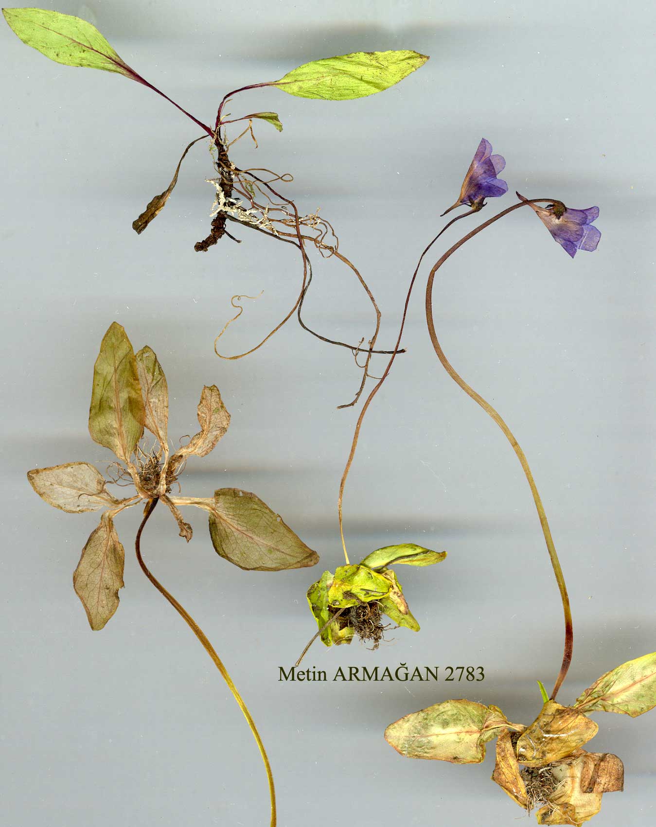 | P. balcanica Casper in Feddes Rep. 66:105 (1962). subsp. pontica Casper in Wiss. Zeitschr. Friedrich-Schiller Univ. Jena, Math.-Nat. R. 19(3):285 (1970). Syn: P. crystallina sensu C.Koch in Linnaea 19:26 (1846) non Sm. (1806); P. leptoceras sensu C.Koch, loc. cit. (1846) non Reichb. (1823); P. alpina Clementi in Mem. R. Acad. Torino ser. 2 (16):315 (1855). Ic: Casper, op. cit. (1970), t. 10 (hairs only). Heterophyllous. Leaves of generative rosette elliptic, 11-25 x 6-13 mm; leaves of vegetative rosette developing with flowers, narrowly oblong, 12-45 x 2-6 (-8) mm. Lobes of upper lip of calyx deeply divided, oval, triangular or lanceolate, those of lower lip connate or divergent. Corolla deep violet-purple, with whitish throat, ll-14.5(-17) mm, distinctly bilabiate, lower lip twice length of upper. Spur subulate, 3.2-5.5(-7.5) mm, straight or downward curved, not forming angle with corolla tube. Capsule exceeding calyx. Ft. 5-7. Wet alpine turf, stream banks, 1600-2745 m. Type: [Turkey A8 Rize] Lazistan, pres Djimil (Cimil), 2000 m, vii 1866, Balansa 327 (holo. GOET, iso. G-DC, K! P). N. & E. Anatolia. A2(A) Bursa: Ulu Da., 1600-1800 m, Moore 7302! ibid., 1700 m, Bornm. 1899:5512 (type of P. vulgaris var. olympica Bornm.)! A5 Kastamonu: Tossia (Tosya), nr Pertschim (Perçin) by Buyuk Ilgas Dagh (E. part of Ilgaz Da.), Sint. 1892:3404! A7 Gümüşane: Karagöl Da., Sint. 1894:7106! A8 Çoruh: Mağara Y., Şavval Tepe, Murgul, 2400 m, Stn. & Hend. 6032! Erzurum: Oltu nr Kabad-Eryuk Y., 13 vii 1911, Sosnovsky. Rize: Pontus mts. S. of Rize, 2745 m, Furse & Synge 883! B8 Erzurum: Erzurum, Calvert 646. B9 Van: d. Hoşap, Kepir Da., 2700 m, D. 23360b! C5 Içel: Bulgar Dagh (Bolkar Da.), Dasch Olugh (Taş Oluk) nr Meneusche, Kotschy 1853:356. Abkhazya, Transcaucasia. Euxine element. Subsp. balcanica is confined to the Balkans and differs in having short, broadly ovate lobes and upper lip of calyx, and straight, obtuse, cylindrical spur of corolla. |