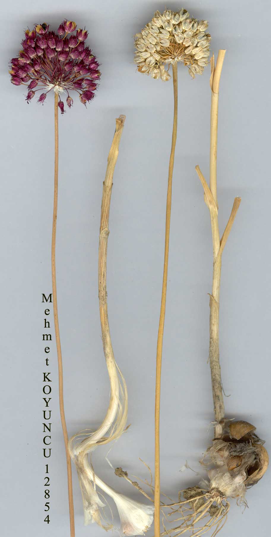 A. atroviolaceum Boiss., Diagn. ser. I(7):1l2 (1846). Syn: A. ampelo-prasum L. var. atroviolaceum (Boiss.) Regel, All. Monogr. 54(1875)! Ic: Fl. RPR II: t. 38 f. 2 (1966); Israel J. Bot. 29:272, f. 3 (1971); Rech. ffl., Fl. Iranica76: t. 6 f. 81 (1971). Figure 6. Map 21. Bulb ovoid, 1-2.5 cm diam.; outer tunics greyish-brown, membranous, becoming fibrous and prolonged upon stem; bulblets yellowish-brown. Stem 50-100 cm. Leaves 3-5, 2-10 mm broad, flat, with scabridulous keel and margins. Spathe 1-valved, soon caducous. Umbel globose, (2.5-)3-6 cm diam., many-flowered, dense. Pedicels unequal, bracteolate at base. Perianth urceo-late-campanulate; segments usually dark purple or biackish-maroon, sometimes vinous-purple, rarely dirty greenish, 3.5-5 mm, outer ovate to oblong, smooth or scabrid, inner ovate, smooth, obtuse. Stamens exserted; median cusp of inner filaments shorter than basal lamina and shorter or as long as lateral cusps. Anthers dark purple. Capsule 2.5 mm. 2n = 16. Fl 6-7(-8). Cultivated fields, vineyards, field and forest margins, meadows, fallow fields, stony slopes, rock crevices, steppic hills, 5-2000 m. Type: [Iran] in hortis et vineis pagiSabst-Buschom prope Schiraz, Kotschy 450 (holo. G!). Widespread. A1(E) Kirklareli: 4 km from Vize to Poyralı, N.&E.Özhatay (lSTE 32132)! A2(A) Istanbul: Ortaburun, Yalova to Çinarik, 150 m, Urdl 227! A4 Çankiri: nr Çankiri, 800 m, Bornm. 1929:14660! A5 Amasya: Amasya, Maniss. 1113! A9 Kars: Kars to lğdir, 1 km S. of Ladikara, 1770 m, Buttler 14468! B2 Manisa: Yeşilova to Durasalli, Hub.-Mor. 5682! B3 Eskişehir: 5 km from Eskişehir to Kütahya, 900 m, D. 36061! B4 Ankara: N. end of Tuz G., 900 m, Sorger 70-8-35! B5 Nevşehir: S.E.of Hacıbektaş, 1200 m, Roper47! B6 Maras: N. of Elbistan, 1240m, Hub.-Mor. 12641! B7Malatya: 7 km from Malatya to Sivas, Alava 6876! B8 Muş: 14km W.of Muş, 1250 m, Mertens & Pasche 81/94! B9 Van: nr Pişvanik, 18 km W.of Gevaş, 1750 m, D. 45998! C2 Denizli: 10 km N.W. of Denizli, 300 m, Sorger 65-14-44! C4 Konya: 55 km N. of Çumra towards Çatalhüyük Köyü (Küçükköy), 1010 m, Buttlerl3633! C5lçel: Arslanköy, 1500m,Koyuncu(AEF6191). C6Hatay: lskenderun, 600 m, Koyuncu (AEF 5439). Eastern C. Europe, Balkans, N. Iraq, Iran, Afghanistan, Caucasia, C. Asia. Some plants from E. Anatolia (Erzurum and Muş) have been referred by Schischkin (Izv. Tomsk. Univ. 80:431, 1928) to A. firmotunicatum Fomin (A atroviolaceum Boiss. var. firmotunicatum (Fomin) Grossh.). According to Grossheim (FL Kavk. ed. 2, 2:269-270, 1940) this variety grows in more xeric conditions and represents the 'wild' form of A. atroviolaceum, whereas the typical A. atroviolaceum (var. ruderale Grossh.) is confined to more mesic, secondary habitats. Var. firmotunicatum differs in its lower stature, narrower, scabrid leaves and sheaths, fewer-flowered umbel and smaller flowers. These differential characters are not constant in the E. Anatolian (Kars, Erzurum) collections; specimens with narrow leaves and fewer-flowered umbels and ones with broader leaves and larger umbels are to be found on the same sheets. |