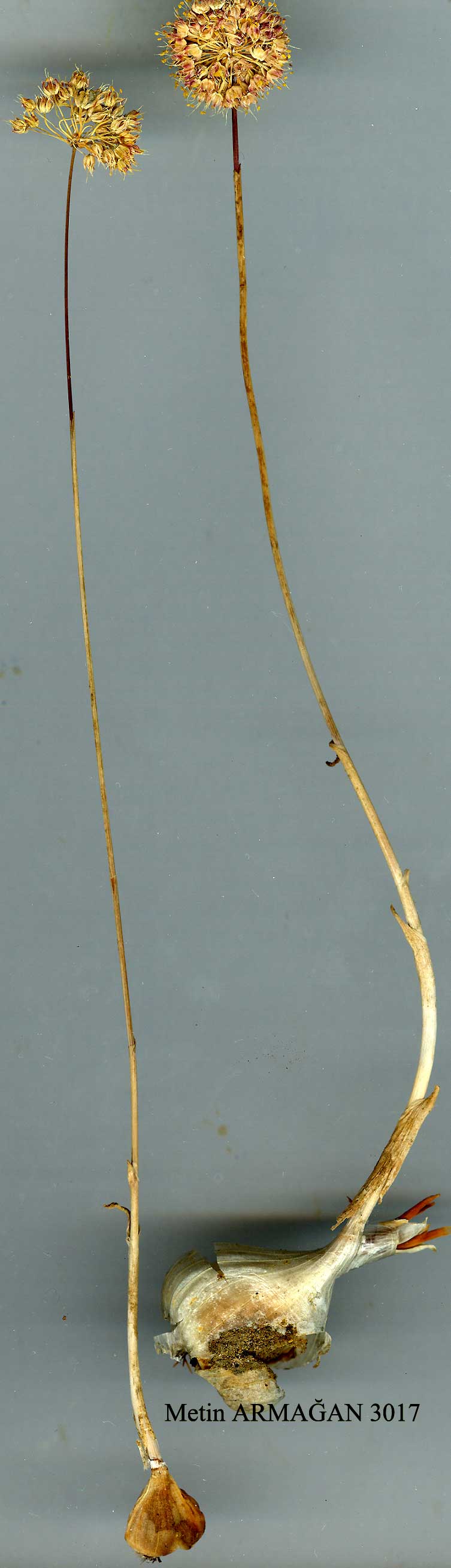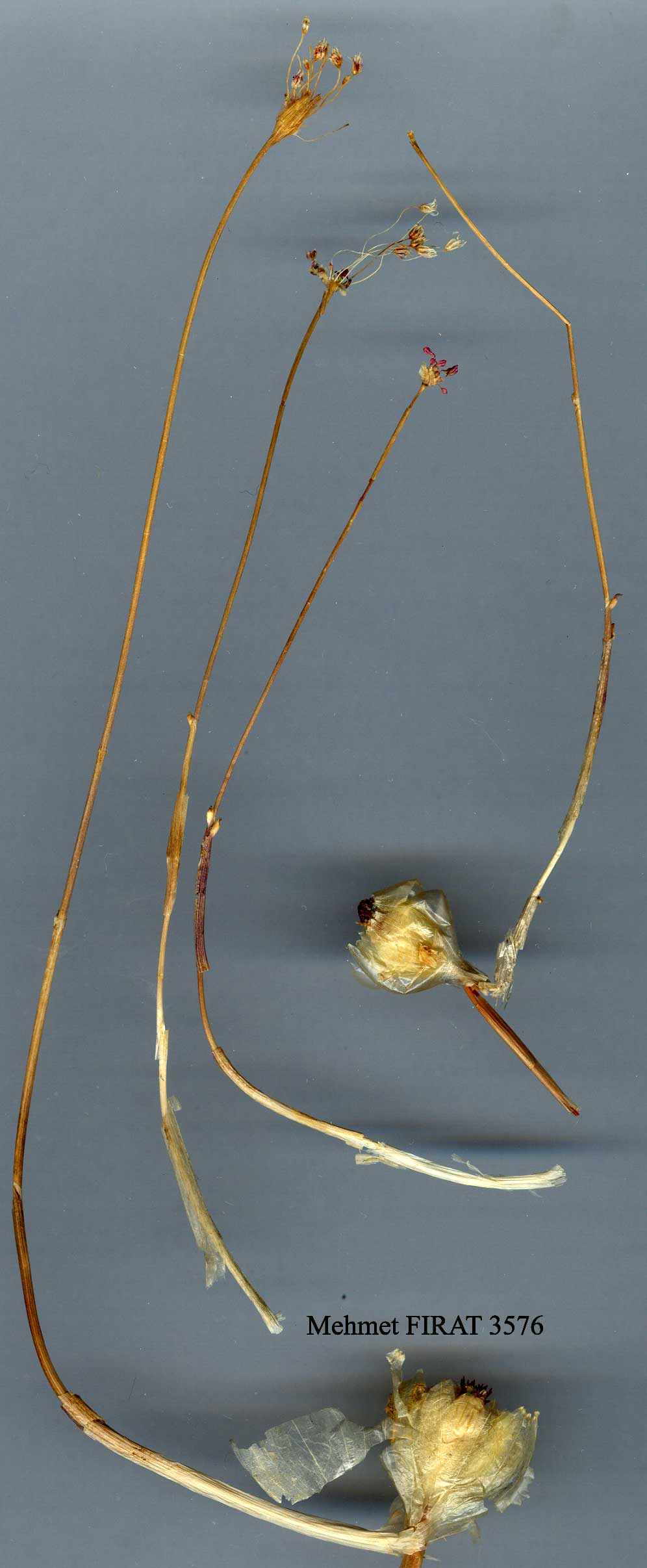 A. microspathum Ekberg in Bot. Not. 122:20, t. 1 & 2 (1969). Figure 4. Map 15. Bulb ovoid, c. 12 mm diam.; outer tunics black, membranous. Stem 15 cm, sheathed to 3/4 or more of its length. Leaves 4-5, semi-cylindrical, 1.5 mm broad, strongly ribbed, scabrid; lower ones withering but not falling off before anthesis, much contorted. Spathe 2.5 mm, brownish, 1-valved, persistent, much shorter than umbel. Umbel hemispherical, 1-1.5 cm diam., c. 25-flowered. Pedicels equal, c. 5 mm, bracteolate. Perianth subglobose; segments 2.5-2.7 mm, brownish or golden greenish-yellow, outside with central brownish striate fascia, inside somewhat shiny and pale green; outer segments elliptic, inner elliptic-oblong, emarginate-truncate at apex. Filaments exserted, outer simple, inner with small obtuse lateral tooth near middle on each side. Anthers yellow. Capsule globose-depressed, 2 mm. Fl. 8. Stony gullies in mountain steppe, coarse herbage, c. 2800 m. Type: Turkey [B9] Van: 20 km N.N.W. of Başkale, Güzeldere Tepe and associated ridges and valleys between Halanduran Dağ and Kepir Dağ (general area of lspiriz Dag), 2800 m, 18 viii 1967, J. M.Watson (Watson et al. 3659), cult. Hort. Bot. Gothob., viii 1968 (nolo. GB! iso. K!). Endemic. Ir.-Tur. element. Known only from the type collection. Allied to A. anacoleum and A. capitellatum. Differs in colour of periaath segments and in the emarginate-truncate inner segments. |