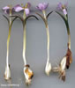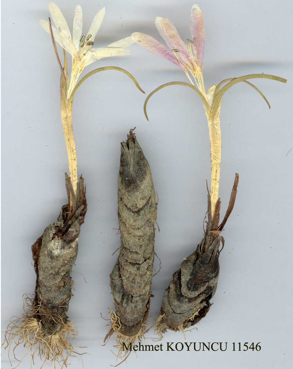 M. trigyna (Steven ex Adam) Stapf in Denkschr. Akad. Wiss. Wien, Math.-Nat. KL 50(1): 18 (1885). Syn: Bulbocodium trigynum Steven ex Adam in Weber & Mohr, Beitr. Naturk. 1:49 (1805)! non Janka (1885); Af. caucasica Bieb., FL Taur.-Cauc. 1:293 (1808); Colchicum caucasicum (Bieb.) Sprengel, Syst. 1:143 (1824); M. raddeana Regelin ActaHortiPetrop. 7:544(1880);M. eichleri Boiss., Fl. Or. 5:168 (1882); M. manissadjianii Aznav. in Bull. Herb. Boiss., ser. 2, 8:248 (1908)! M. navis-noae Markgraf in Kulturpfl. Beilı. 3:340 (1962). Ic: Bot. Mag. 65: î. 3690 (1839), as M. caucasica; Rix& Phillips, Bulb Book 32(g) (1981). Corm oblong-ovoid, 15-35 x 10-20 mm; outer tunics black or blackish-brown, coriaceous; innermost tunic dark brown with a short neck to 2(-3) cm. Leaves (2-)3(-4), linear to linear-lanceolate, 1-4 x 0.2-0.6(-l) cm at anthesis, to 17 x (0.3-)0.4~0,8(-1.8) cm at maturity, acute, green, glabrous. Flowers l-2(-3), white to purplish-pink. Limb of perianth segments oblanceolate to narrowly oblanceolate, 20-26(-30) x (4-)6-8(-9) mm, base usually aurieulate. Filaments 1.5-4 mm; anthers black, purplish-black, greenish-black or olive-brown. occasionally (fide Stefanoff) yellow, 2-3(-4) x 1 mm; pollen yellow. Capsule ellipsoid to ovoid, 15-30 mm. FL (3-)4-6{-7). Limestone and shaky screes, alpine pastures at edge of snowpatches, Pinus forest, 1300-3400 m. Type: [USSR, Caucasia! circa Tiflisium (Tbilisi) et ad lineam Caucasicam, JJF. Adam (holo. LE, iso. K!). Widespread except in N.W.Turkey. A4 Kastamonu: Ilgaz Da., 2135 m, D. 21554! A5 Amasya: Tavchan Dagh (Tavşan Da.) nr Merzifon, 8 v 1907, Man-iss. (type of if. manissadjianii)! Samsun: Ak Da. nr Ladik, 1800 m, Tobey 972a! A8 Erzurum: Dumlu to Tortum, 2100 m, T. Baytop (ISTE 34895)! A9- Kars: d. Kagizman, Desizgölü köyü, 1300 m, Güneş, 1501! B3 Konya: Sultan Da., Kizil Tepe 11 km S.W. of Akşehir, 2200 m, Watson et al. 2593! B4 Ankara: c. 20 km N. of Tuz G., Rix et al. 1534 (fr.)! B7 Sivas: Kizil Da., 2150 m, Larnond 2629! B8 Erzurum: Palandöken pass W. of Erzurum, 2300 m, Mathew & Tomlinson4319! B9 Van: Çuh pass between Hoşap and Başkale, 3000 m, Rix et aJ. 1963! BIO Kars: top of pass between Doğubayazit and iğdir, 2500 m, Mathew & Tomlinson 4265! C1 Aydin: N. of Aydin, Paşa Y., 1400 m, Uslu 3888! C2 Antalya: Ak Da., S.W. of Elmali, 2000 m, Sorger 68-26-77! C3 Isparta: d. Eğridir, Yakaköyü, above Melikler graveyard, 1700-2000m,Peşmen 3484! C7ürfa: KaracaDa., 1500m,T.Baytop (ISTE 34459)! C10 Hakkari: Mor Da., 3400 m, Watson et al. 3012! Caucasia, N.W. Iran. Ir.-Tur. element. Very closely allied to M. attica and not always easily separable from it. Specimens from C2 Muğla (Göktepe, Guichard TUR/66/62!) have scabrid or glabrous leaf margins; however, those from C.2 Antalya (e.g. Ak Da., 2800 m, Contandi. et a!.!) have glabrous margins as in M. irigyna but more closely resemble M. attica in number of Jeaves and shape of perianth segments. Plants from the eastern part of the range with broad leaves, broad perianth segments and filiform basal auricles haye been distinguished as M raddeana Regei but considerable variation in leaf breadth occurs in populations of M. trigyna throughout its range. Although many specimens have basal auricles their shape varies considerably and in some gatherings they are absent. There is a tendency for broader-leaved specimens to occur in the eastern part of the range, but specimens from CI Aydin, e.g. Uslu 3888, .also have leaves up to 18 mm broad as well as flowers with relatively narrow perianth segments. |