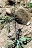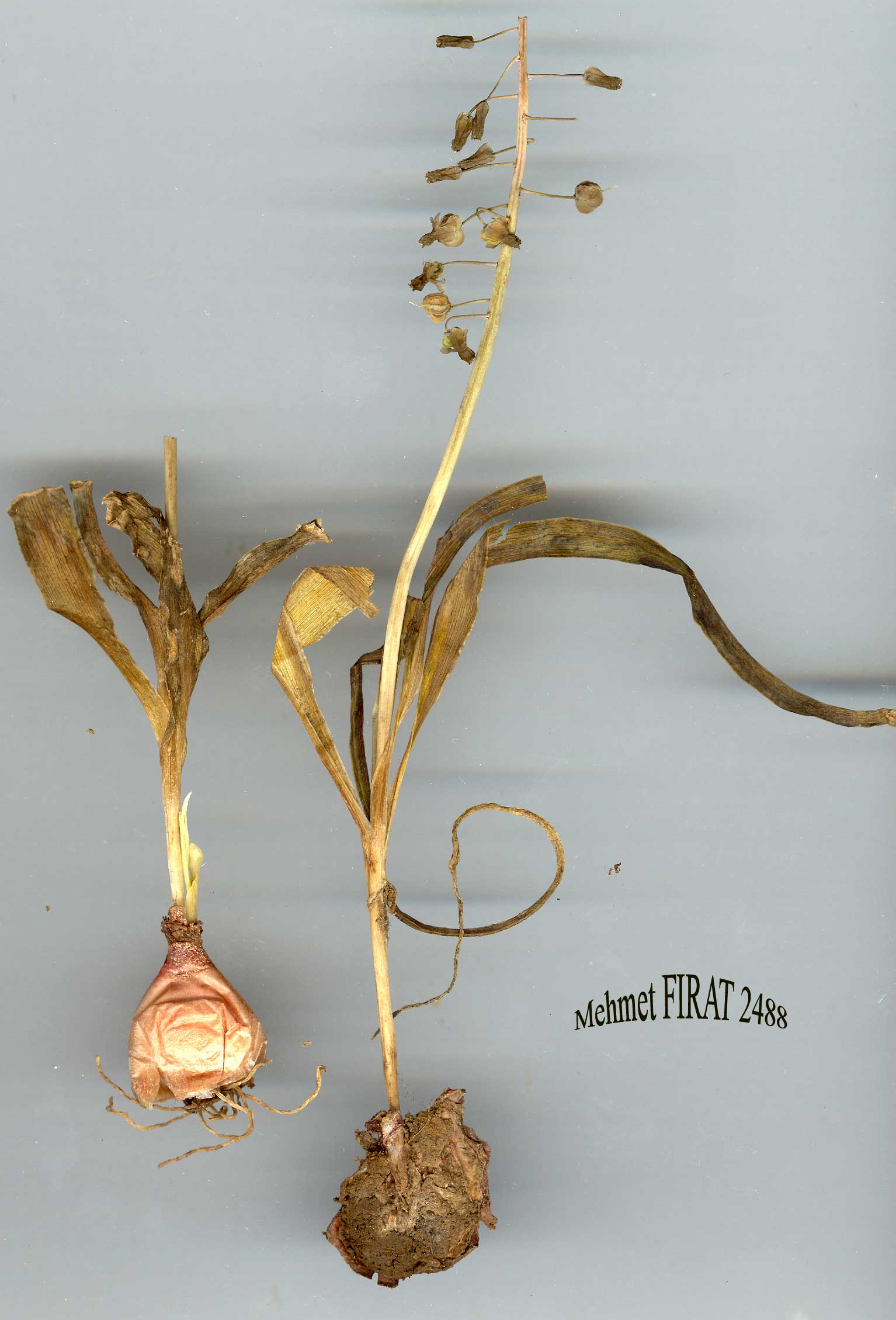 M. longipes Boiss., Diagn. ser. 1(13):36 (1854). Syn: M. albicaule Post, Pl. Post. 1:13 (1890)! M. aaronsohnii Opphr. & Beauv. in Bull. Soc. Bot. Geneve ser. 2, 22:278 (1931)! Leopoldia longipes (Boiss.) Los.-Los. in F1.ÜRSS 4: 410 (1935)! M. buschiricum Parsa var. pumilum Parsa in Kew Bull. 1949:35 (1949)! M. dinsmorei Rech. fil. in Ark. Bot. ser. 2, 1:507 (1952)! M. desert-icolum.Rech. fil. in Ark. Bot. ser. 2, 5:87 (1960)! M. atropatanum Schchian, nomen! Ic: Bull. Soc. Bot. Genève ser. 2, 22:279 f. III (1930), as Af. aaron-sohnii. Map 39. Buib 1.5-4 cm diam.; tunics ivory or pale pinkish. Leaves 3-9, usually twisted or circinnate, linear, 15-50 x 6-32 mm, acute, canaliculate, ±glaucous. Scape 20-60 cm (rarely more). Raceme lax, 6-50 cm x 5-30 mm, 80-200-flower-ed. Pedicels of fertile flowers patent or recurved (position often distorted by pressing), much longer than perianth, elongating after fertilisation to 50-80 mm to form a tapering oblong to conical inflorescence. Fertile flowers slightly nodding (in vivo), oblong-conical, 7-12 mm, lower 2/3 of tube beige or mauvish-brown, shoulders sharply angled and dirty white to beige, abruptly constricted above shoulders; lobes blackish. Pedicels of sterile flowers spreading or deflexed, as long as to much longer than the violet, closed, narrowly obovate-oblong sterile flowers. Capsule ovate-elliptic, 9-10 x 5-6 mm, acute. FL 4-6. Calcareous steppe, ravines, fallow fields, 550-1525 m. Type: [Palestine] in arvis pinguibus Palaestinae littoralis calidioribus ad meridiem urbis Gaza sitis et in regione Philistaeorum ad septentrionem ejusdem urbis, Boissier (holo. G!). Inner Anatolia. A3 Ankara: d. Beypazarı, Aladağ vadisi, 700 m, Akman 858! A4 Ankara: Çubuktal nr Ankara, 20 v 1932, Kotte! A5 Kastamonu: Tosya, Kavakçesme, Sint. 1892:4014! A6 Sivas: 24 km from Suşehri to Zara, 1520 m, Apold et al. 35b! B4 Ankara: Dikmen Da. S. of Ankara, 12 v 1942, Romieux (Hb. Hub.-Mor.)! B6 Sivas: 11 km E. of Sivas, 16 vi 1939, Reese (Hb. Hub.-Mor.)! B7 Tunceli: Pertek to Tunceli, 42 km from Elaziğ, 1400 m, D. 29112! B8 Muş: Muş, T. Baytop (cult. K)! C6Gaziantep: Aintab (Gaziantep), Haradj. 1304 (type of M. haradjianii Rech. fil.)! Urfa: 10 km N.W. of Birecik, 550 m, Sorger 80-8-32! C8 Mardin: 12 km from Gercüş to Hasankeyf, 700-800 m, D. 43053! Transcaucasia, W. Syria, Syrian Desert, N. Iraq, Iran. Ir.-Tur. element. A very variable species, most of the Anatolian material being different in habit and measurements to that from Palestine. lt is sometimes difficult to draw a line between this species and M. tenuiflorum, especially in S.E. Anatolia and W. Iran. The twisting of the leaves characteristic of M. longipes is not always expressed on the deep soil of cultivated or fallow fields. |