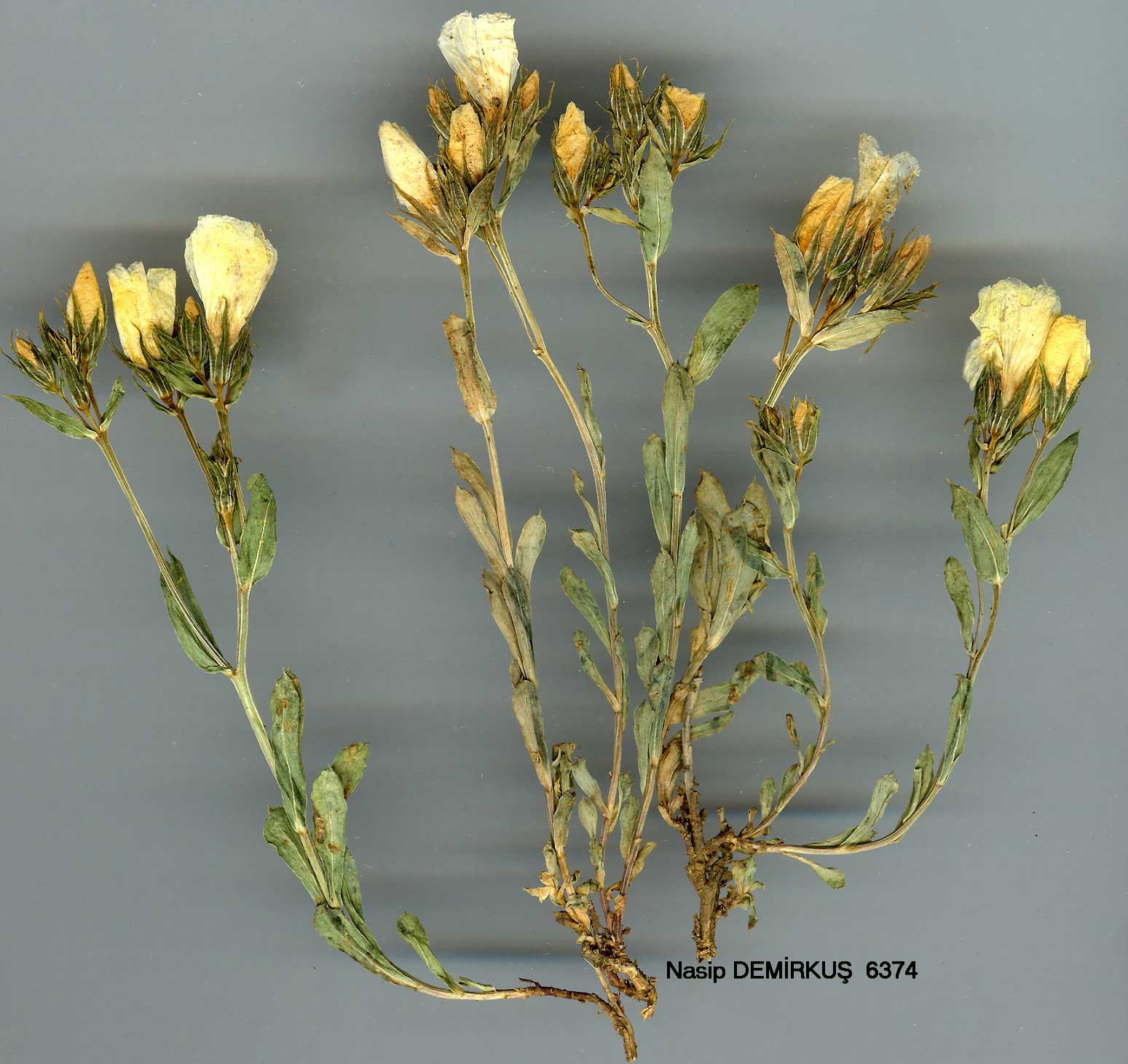 | L. mucronatum Bertol., Misc. Bot. (1): 18 (1842) non Gilib. (1792) nomen illegit. Map 32, p. 423. Herbaceous or suffruticose perennial, ± glaucous, usually glabrous. Flowering stems lined but smooth, 5-30 cm. Median cauline leaves usually 1-nerved, with stipular glands, oblong to oblong-lanceolate or linear, acute or acuminate, 1-3 cm. Sterile rosettes none or few at flowering time, or with an imbricate column of small spathulate leaves on long sterile shoots, or at the base of flowering stems. Cymes 3-many flowered, often with widely spreading branches, at least in fruit. Sepals lanceolate, linear-lanceolate or rarely ovate, acuminate, 6-13(-15) mm, often keeled, margin membranous and ± glandular-ciliate. Petals yellow or apricot-yellow, often with a purple claw, 15-28 mm. Capsule (4-)5-6 mm; beak 1 mm. A very variable species, of which a wider view is taken here than in my earlier revision (Notes R.B.G. Edinb. 22: 151-157, 1957). Four often intergrading subspecies can be recognised in Turkey. 1. Plant strongly shrubby at base, the lower leaves small, spathulate, and densely imbricated in a column (as on the numerous sterile shoots); petals apricot-yellow subsp. mucronatum 1. Plant herbaceous, the lower leaves not as above; petals clear yellow, with or without a purple claw 2. Sepals 7-13(-15) mm; leaves 2-7 mm broad, often broadest above, flat; cymes 3-many-flowered, lax; petals 20-28 mm, with or without a purple claw 3. Stems straight; leaves oblong, acute; cymes divaricate (branching at 45°); petals yellow throughout; sepals c. 1+ x capsule (Mesopotamia) subsp. orientale 3. Stems usually flexuous; leaves oblong, obovate or linear-oblong, usually abruptly acuminate; cymes more widely divaricate; petals with or without a purple claw; sepals c. 2(-3) x capsule (Widespread) subsp. armenum 2. Sepals 6-8 mm; leaves l-l.5(-2) mm broad, linear, involute; cymes 3-7-flowered, compact; petals 15-20 mm, plain yellow subsp. gypsicola 4. Leaves glabrous var. gypsicola 4. Leaves papillose-puberulent var. papilliferum subsp. mucronatum. Syn: L. sulphureum Boiss. & Hausskn. ex Boiss., Fl. Or. 1: 857 (1867),! L. rigidissimum Post in J. Linn. Soc. Bot. 24: 424 (1886). Fl. 4-6. Disturbed calcareous steppe, rocky slopes, fallow fields, 450-1200 m. Type: ex oris Euphrates (sic), Chesney 186 (K! BM!). B7 Tunceli: Tunceli to Pülümür, 1100 m, D. 19230! C6 Gaziantep: Gaziantep, 900 m, Balls 794! Maraş: Ahir Da. above Maraş, 1100 m, D. 27485! Urfa: Rum Kala'a, Sint. 1888: 269! C8 Mardin: Mardin to Savur, 1200 m, D. 28532! N. Iraq, Syrian Desert. Ir.-Tur. element. Contrary to my earlier account (Notes R.B.G. Edinb. 22: 151, 1957), reconsideration of the type material has led me to treat L. sulphureum as synonymous with L. mucronatum. Two Turkish specimens are ± intermediate between subsp. mucronatum and subsp. armenum: C7 Urfa: Birecik to Suruç, 700-800 m, D. 27977! Mardin: Kiziltepe, 600 m, D. 28665! |