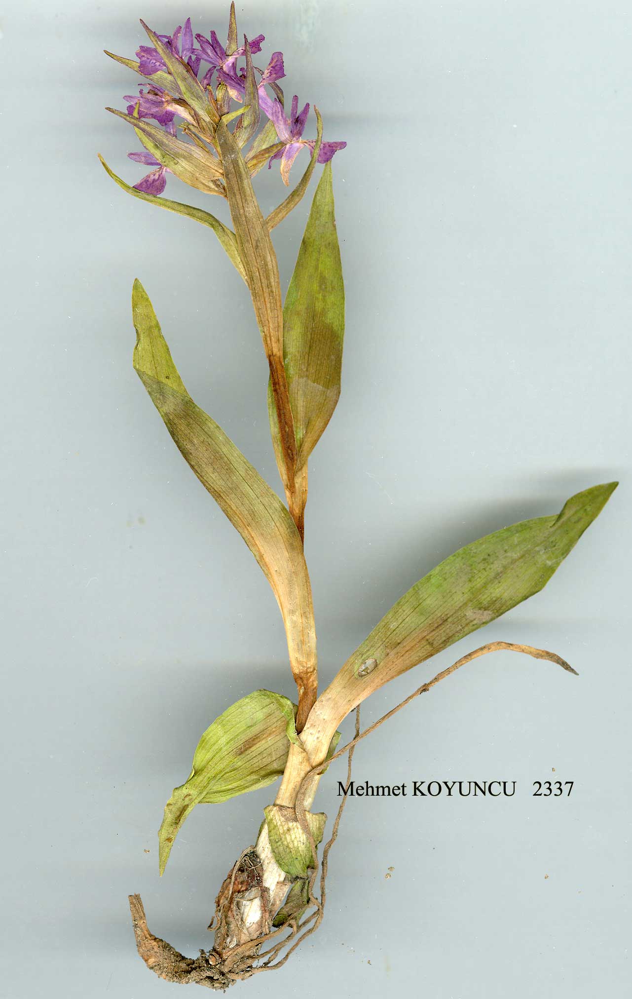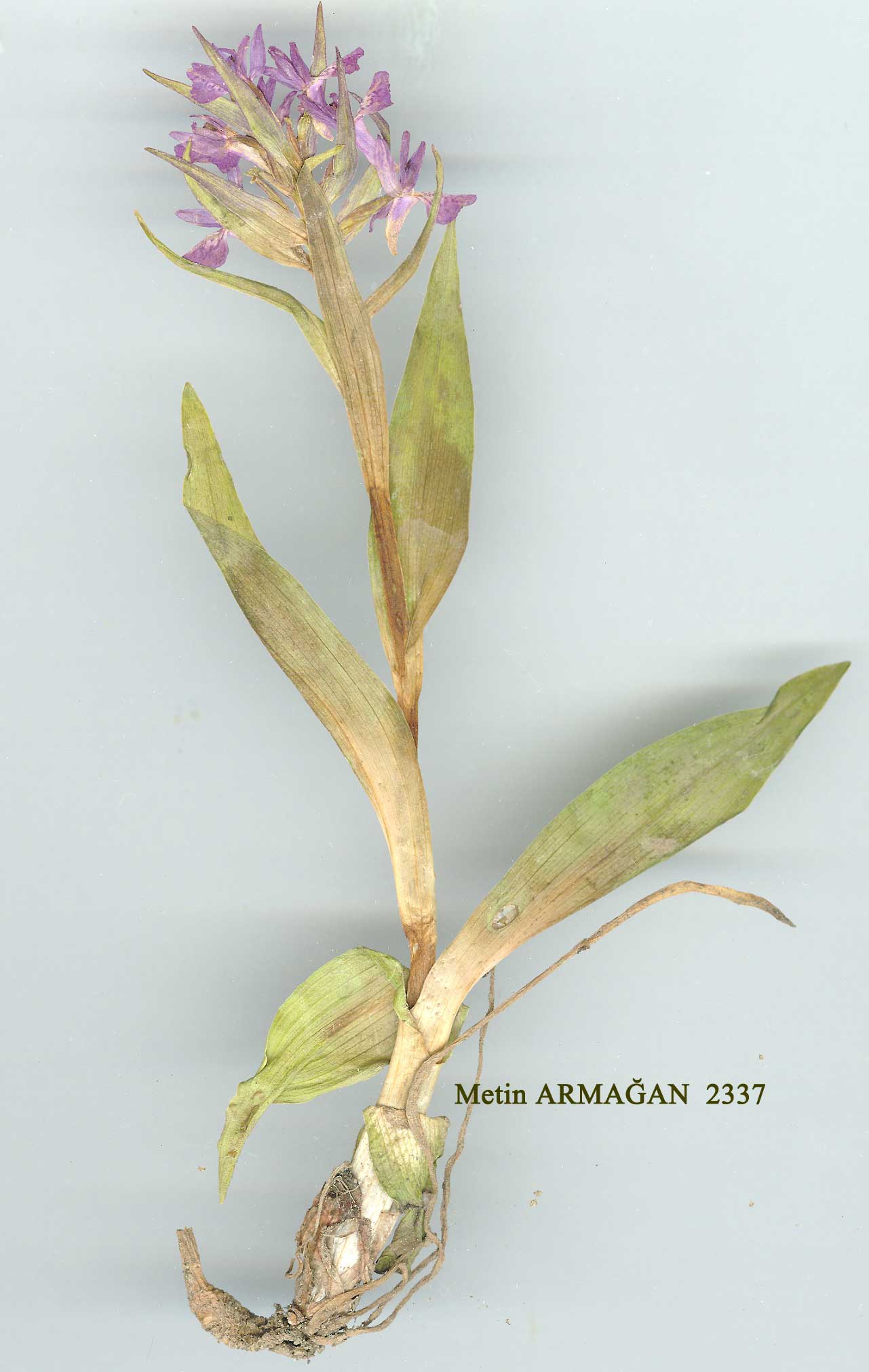 D. euxina (Nevski) H. Baumann & Künkele in Mitt. Bl. Arbeitskr. Heim. Orch. Baden-Württ. 13:235 (1981). Plants 7-25(-30) cm. Stem hollow, with 3-6 ovate to lanceolate leaves;lower leaves obtuse, upper acute, equalling or exceeding spike, all with numerous minute blackish-violet spots or fine streaks, sometimes regularly arranged in lines parallel to veins, or unspotted, sometimes flushed with purplish-violet on both sides. Spike shortly cylindrical, 3-7 cm, dense. Lower bracts lanceolate, exceeding flowers, ± spotted or tinged blackish-violet. Flowers dark magenta purple or crimson. Sepals ovate-lanceolate, acute or acuminate, ± faintly spot-ted, to 12(-14) x 5 mm. Petals slightly smaller. Labellum usually broader than long, 9-10 x 8-11(-15) mm, entire or subentire, margins irregularly erose-dentate or even fringed, faintly spotted, slightly papillose towards base. Spur saccate-cylindrical, ± obtuse, shorter than ovary, 6-9 mm, to 3-4 mm broad near base. 1. Plants slender, 15-25(-30) cm ;Jeaves 3-4(-5),rather small, evenly distributed on stem, narrowly oblong to lanceolate, (3-)4-6 x 1-1.5 cm, mostly obtuse, rarely unspotted, uppermost bract-like, ± reaching spike ;labellum roundish, 9-10 x 8-11 mm var. euxina 1. Plants dwarf, compact, 5-15(-20) cm; leaves (3-)4-5(-6), densely covering stem, ovate to lanceolate, 3-6(-9) x 1.5-3(-5) cm, frequently unspotted, reaching or exceeding spike; labellum mostly broader than long, to 8(-13) x 13-15 mm, sometimes with conspicuously projecting triangular or tooth-like lobe at apex var. markowitschii var. euxina. Syn: O. cordigera sensu Kränzlin in Feddes Rep. Beih. 65:39 (1931) non Fries (1842); O. cordigera Fries var. caucasica Kl. apud Lipsky in Acta Horti Petrop. 14:306 (1897) nom. nud.; O. monticola Kl. subsp. caucasica Kl in Acta Horti Petrop. 17:181 (1898); O. caucasica (Kl.) Lipsky, Fl. Kavk. 457 (1899); O. caucasica (KL) Medwedew in Trudy Tblissk. Bot. Inst. 18:476 (1919) non Regel (1869) nom. illegit.; O. euxina Nevski in Fl. URSS 4:709 (1935)! D. cataonica (Fleischm.) Holub subsp. caucasica (Kl.) So6 in Ann. Univ. Sci Budapest, Biol. 11:69 (1969);/). majalis (Reichb. fil.) P.F. Hunt & Summernayes subsp. caucasica (Kl.) Sunderm., Europ. Medit. Orchid, ed. 2:45 (1975). Ic: Grossh., FL Kavk. 2: t. 31 f. 9 (1940), as O. caucasica;F1. Grazi 2: t. 79 (1941), as O. caucasica. Map 106. Fl. 6-7(-8). Wet peaty meadows, nr springs and rivulets, forest margins, 1150-2900 m. Lectotype designated here: [USSR, E. Caucasia] in jugo Aigba, in pratis humidis, 1700-1800 m, V. Chmolevski 3056 (LE!). N.E. Anatolia. A8 Trabzon: E. side of Of valley, Ilica to Kaçkar Da., 2700 m, Watson et al. 236! Rize: N. side of Ovit pass, 1900-2000 m, Renz & Taub. 12105! Çoruh:Tiryal Da., Murgulto Damar, 1150 m, Düzenli 710! A9Çoruh: Yalnizçam Silsilesi 10 km E.S.E. of Şavşat, 2000-2400 m, Watson et al. 3187! Kars: S.W. slope of Kisir Da., 2500 m, D. 30560! B8 Erzurum: nr Erzurum, Tchihatcheff 1854:668! B9 Erzurum: Çakmak Da., above Karayazi, 2500-2900 m, Watson et al. 1670! Ağri:3km N. of Cumaçay, 2000 m,Taub. 81.269! Caucasia. Euxine element. |