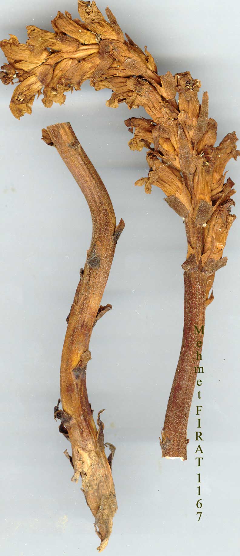 O. caryophyllacea Smith in Trans. Linn. Soc. London 4:169 (May 1797). Syn: 0. vulgaris Poiret in Lam., Encycl. 4:621 (Nov. 1797); O. galii Duby, Bot. Gall. 1:349 (1828). Ic: Ross-Craig, Draw. Brit. Pl. 23: t. 24 (1966). Stem 15-60 cm. Bracts usually equalling flowers. Calyx halves many-veined, bidentate or undivided, glandular-pilose; teeth acuminate, 3-veined, c. half length of corolla tube. Corolla 17-35 mm, wide, inflated above insertion of stamens, enlarged towards throat, pale (also at base) brownish lilac, often purplish or reddish, rarely yellow or whitish, glandular-pilose, dark brown in dried state; dorsal line nearly straight from a curved base, upper lip curved downwards with an erect tip, rarely completely curved; limb abundantly glandular-pilose. Stamens inserted 0-5 mm above base, filaments articulate-pilose in lower half, abundantly glandular-pilose in upper half, anthers conspicuously mucronate. Stigma dark purple or brown, rarely orange, reddish-yellow or yellow. Fl. 4-7. Usually on Galium and Asperula, nr s.I.-3300 m. Described from Europe. N., W., C. & S.E. Anatolia; scattered. A1(E) Tekirdağ: Kumbağ, N. & E. Özhatay (ISTE 28358). A2(A) Istanbul: Kayiş Da., A. Baytop (ISTE 4052)! A4 Kastamonu: Ilgaz Da., 2000 m, Darrah 56! A8 Erzurum: Kop Da., Aşkale to Bayburt, 2400 m, Hub.-Mor. 16789. Bl Izmir: Izmir to Bayraklı, Schwarz 543. B2 Kütahya: 16 km from Demirci to Simav, 1200 m, Hub.-Mor. 16794. B3 Konya: Sultan Da., 1200 m, Bornm. 1899:5410. B5 Kayseri: Erciyas Da., 1800 m, 1902, Penther & Zederbauer. B7 Erzincan: 6 km below Kemaliye, 920 m, Hub.-Mor. 10478. B9 Van: Pelli Da., 3000 m, Edmondson 650! C4 Konya: 20 km from Ermenek to Fariske, 1350 m. Hub.-Mor. 10472. C5 Niğde: Üç Kapi Da., 1900 m, Siehe 1906: 422! C6 Hatay: Harbiye to Şen-köy, 500 m, D.27207! N.W. Africa, Europe, S.W. Asia, eastwards to Pakistan. |