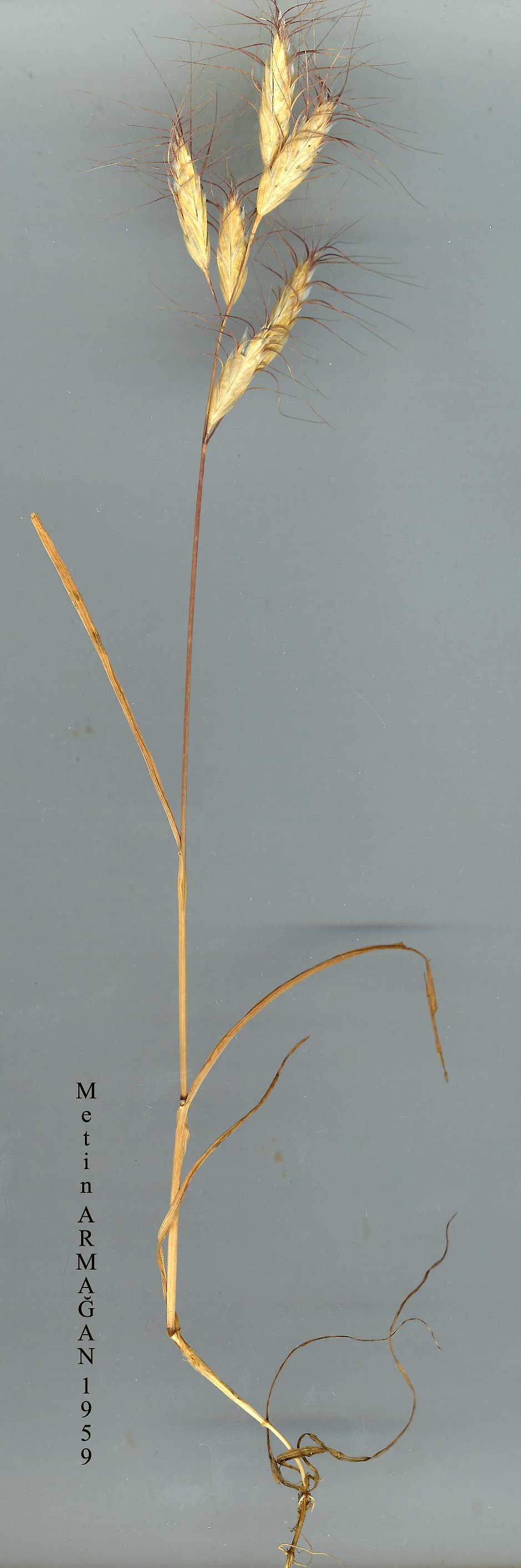B. danthoniae Trin. in C.A. Meyer, Verz. Pfl. Cauc. 24 (1831). Ic: Fl. URSS 2: t. 42 f. 5 (1934); Fl. Iraq 9: t. 47(1968). Annual. Stems 5-40 cm, erect or ascending. Leaf sheaths pubescent. Leaf blades 2-10 cm x 2-5 mm, pubescent. Panicle 2-10 x 1-5 cm, ovoid, stiffly erect, usually dense, often simple or racemose; branches and pedicels shorter than spikelets. Spikelets 10-40 x 4-10 mm, lanceolate to oblong, laterally compressed. Lower glume 6-8 mm, lanceolate, upper glume 7-9 mm, elliptic. Lemma 8-12 mm, margins broadly hyaline, bluntly angled c. 1/3 down from lacerate apex; awns usually 3, borne 2-4 mm below lemma apex, central one longest (5-15 mm), basally flattened, divaricate and sometimes twisted when ripe, lateral ones shorter than central awn (rarely subequal), otherwise similar, sometimes absent or very small on lower lemmas, all often deep red or purple. Palea shorter than lemma. Anthers c. 1.5 mm. 2n = 14. Fl. 5-8. Dry limestone screes, slopes and fields, and as a weed of irrigated fields, 500-2170 m. Type: [Soviet Azerbaijan] e locis lapidosis aridis montium Talüsch prope pagum Swant, 1225 m, [22 vi 1830], C.A. Meyer (holo. LE). N. & Inner Anatolia. A4 Ankara: nrKizilcahamam, 1200m, McNeill269a! A6 Sivas: Yildiz Da., Çirçir, 1400 m, Tobey2327! A9Kars: 15km from Tuz-luca to Kağizman (Aras valley), 950 m, D. 43604! B4 Konya: Cihanbeyli, D. 18607! B5 Nevşehir: Nevşehir to Ürgüp, 1200-1300m,D. 19133! B6Malatya: 10 km E. of Darende, 900 m, McNeill 431! B7 Elaziğ: 9 km from Elaziğ to Hazar G., 850 m, D. 28971! B8 Diyarbakir: above Hani, 1000 m, Kit-Tan 1913! B9 Bitlis: Tatvan, 1890 m, Tong 32! B10 Ağri: slopes of mt. Ararat, 13 km S. of Iğdir, Jardine 556a! C6 Maraş: Narli to Karabiyikli, 600-700 m, D. 27849! C7 Adiyaman: 45 km from Adiyaman to Kömur, 1090 m, Kit-Tan 2136! C8 Mardin: 12 km from Gercüş to Hasankeyf, 700-800 m, D. 43050! C9 Siirt: 14 km from Şirnak to Cizre, 610 m, D. 42865! C10 Hakkari: Yük-sekova, 1950 m, D.44965! S. Russia, S.W. Asia (incl. Cyprus) eastwards to Himalayas and Tibet. Sect. Boissiera (Hochst. ex Steudel) P.M. Smith (Syn: Boissiera Hochst. ex Steudel, pro gen.). Annual. Spikelets lanceolate, terete; lower glume 3-veined, upper 5-7-veined. Lemma erose at tip, rounded on back. Awns 5-9, flattened, divaricate, patent or recurved. |