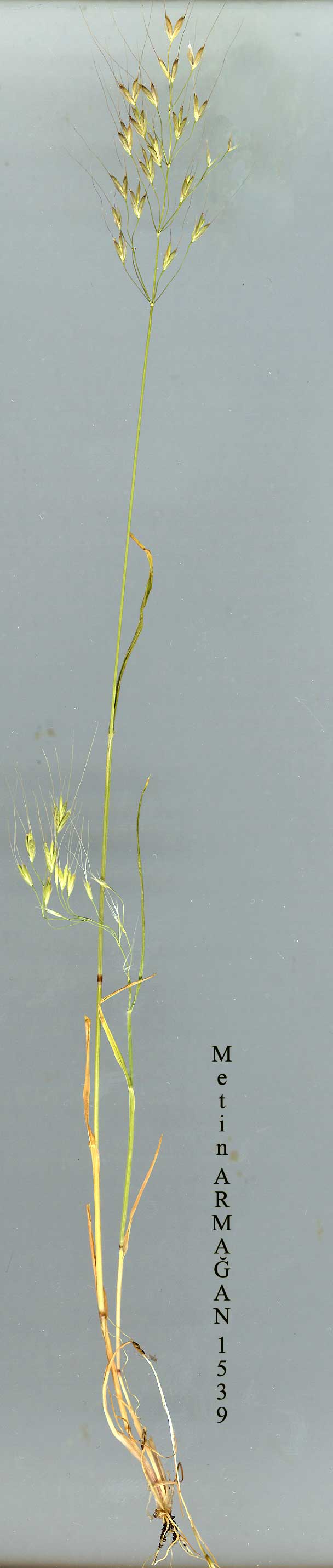 | B. gracillimus Bunge in Mém. Acad. Sav. Étr.Petersb. 7:527(1851). Syn: B. crinitus Boiss. & Hohen. in Boiss., Diagn. ser. 1(13):64 (1854) ;Nevskiella gracillima (Bunge) V. Krecz. & Vved. in Acta Univ. Asiae Med. ser. 8b (Bot.) 17:22 (1934). Ic: Fl. URSS 2: t. 42 f. 6 (1934); Fl. Kazakh. 1: t. 21 f. 3 (1956). Figure 11. Annual. Stems 12-30 cm, erect. Leaf sheaths pubescent. Leaf blades 3-12 cm x 1.5-4 mm, pubescent. Panicle 3-8 x 1-4 cm, erect, open, branches and pedicels longer than spikelets (excl. awns), ascending, sometimes flexuous, slender. Spikelets 4-7 mm, ovate-lanceolate, pubescent, florets at first imbri-cate, later becoming divaricate. Glumes subequal, lanceolate, acuminate, 4-5 mm. Lemma 4-4.5 mm, elliptic-lanceolate; awn 12-19 mm, very slender. Palea equalling lemma. Anthers 0.5 mm. Caryopsis filling the floret. Fl. 6-7. Alt. to 2900 m. Type: [USSR, Kirghiz] in der Wüste Karakum bei Kuk-Kabak zwischen Tschi (Lasiagrostis splendens), 19 v 1842, A. Lehmann (holo. LE, iso. K!). E. Anatolia; rare. B9 Van: 2 km from Başkale to Güzelsu, 2900 m, Sorger 82-59-11! Iran, Afghanistan, Pakistan, Turcomania. Ir.-Tur. element. |