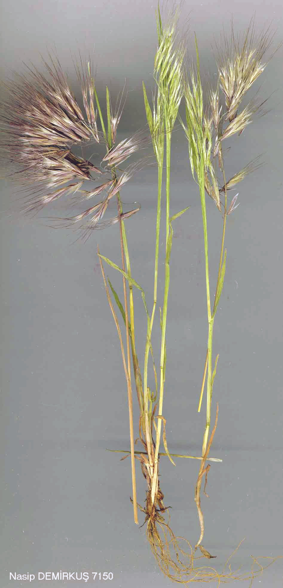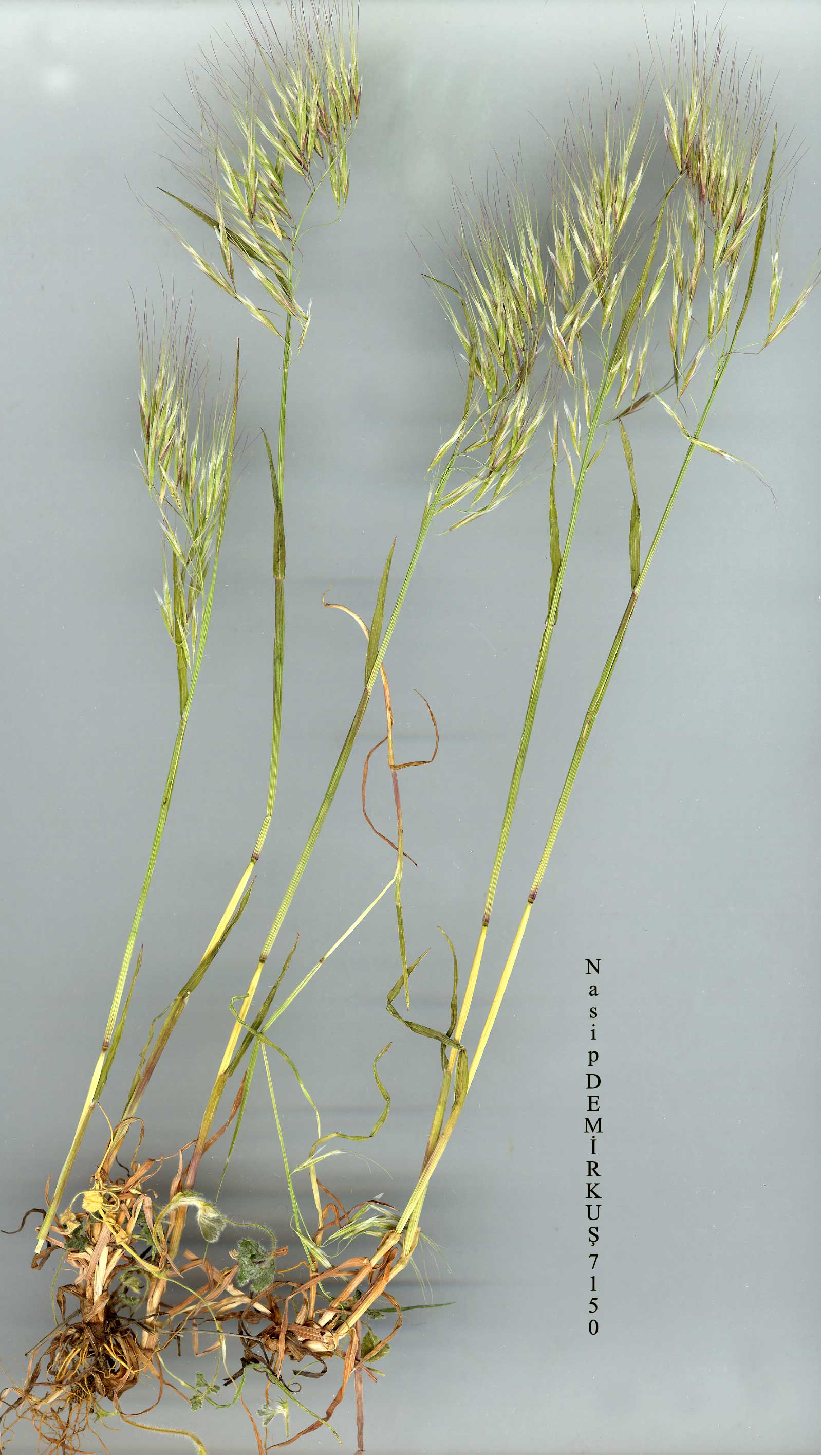 B. tectorum L., Sp. PL 77 (1753). Syn: Anisantha pontica C. Koch in Linnaea 21:394 (1848)! Zerna tectorum (L.) Lindm., Svensk Fanerogamfl. 101 (1918)! A. tectorum (L.) Nevski in Acta Univ. Asiae Med. ser. 8b (Bot.) 17:22 (1934)! Ic: Bonnier, Fl. Compl. Fr., Suisse et Belg. 12: t. 682 f. 3199 (1934);Fl. RPR 12: t. 64 f. 1 (1972). Annual. Stems 5-70 cm, erect, solitary or forming tufts. Leaf blades 4-15 cm x 2-4 mm, pubescent; at least lower sheaths hairy. Panicle 5-15 x 2-8 cm, usually dense, becoming secund, nodding, pale green, often shining) branches slender, hairy, flexuous, bearing up to 8 spikelets often forming a fascicle.Spik'elets 10-18 x 3-5 mm, lanceolate. Glumes lanceolate, lower 5-8 mm, upper 7-11 mm. Lemma 8-12 x 2-3 mm, lanceolate, with shining hyaline margins'; awn 10-18 mm, straight, slender. Palea clearly shorter than lemma. Stamens 3; anthers to 2 mm. Caryopsis 6-9 mm. Fl. 3-6. Dry, open grassland, sandy places, ruins, as a weed and ruderal, s.l-2000 m. Described from Europe. Type (Smith, op. cit. 500, 1985): Hb. Linn. 93/25! Widespread. A1(E) Kirklareli: Büyükkariştiran, A. Baytop (ISTE 6521)! A1(A) Çanakkale: Lampsacus(Lapseki), v-vi 1821, Steven(!). A2(E) Istanbul: Alibey köyü, Avçiğil (ISTE 5848)! A3 Bolu: 26 km W. of Gerede, 1100 m, Sorger 71-64-17! A5 Amasya: Havza to Merzifon, A. Baytop (ISTE 9090)! A6 Amasya: Erbaa above Kozlu, 800 m, Tobey 2215! A7 Trabzon: Maçka, Hamsiköy forest, 1300 m, Anşin 1189! A8 Erzurum: Çoruh gorge nr Ispir, 1200 m, C. Koch (type of Anisantha pontica C. Koch)! A9 Kars: Kisir Da. above Susuz, 2000 m, D. 30514! Bl Izmir: Birgi, T. Baytop (İSTE 6483)! B2 Izmir: Boz Da., 1100-1500 m, Sorger68-16-63! B3 Afyon: Afyon, A.Baytop (İSTE 9384)! B4 Ankara: N.E. side of Tuz G., A. Baytop (İSTE 7112)! B5 Nevşehir: 10 km N. of Nevşehir, 1250 m, Roper 128! B6 Sivas: 22 km W. of Divriği, 1400 m, Sorger 79-24-16! B8 Bitlis: 3-5 km N. of Baykan, 1000 m, D. 43157! B9 Bitlis: Bitlis to Tatvan, 1800 m, D. 23368! B10 Kars: 3 km S.W. of Iğdir D.Ü.Ç., 800 m, D. 43786! Cl Muğla: 8 km E. of Reşadiye, S.1.-5 m, Sorger 82-23-10! C2 Antalya: Susuz Da., 1400-1700 m, Sorger 65-24-85! C3 Antalya: Antalya to Serik, 2 m, D. 25668! C4 Içel: Uzuncaburç, 900 m, Sorger 71-23-9! C5 Adana: nr Tuzla, s.l., Coode & Jones 322! C6 Malatya: 29 km N. of Gölbaşi, 1180 m, Sorger 71-43-15! C7 Urfa: halfway between Viranşehir and Ceylanpinar, 500 m, D. 42354! C9 Siirt: Şirnak to Cizre, 610 m, D. 42684! Is: Psara, Mavri Rahi, 10-100 m, Greuter 10978! Eurasia, N. Africa. |