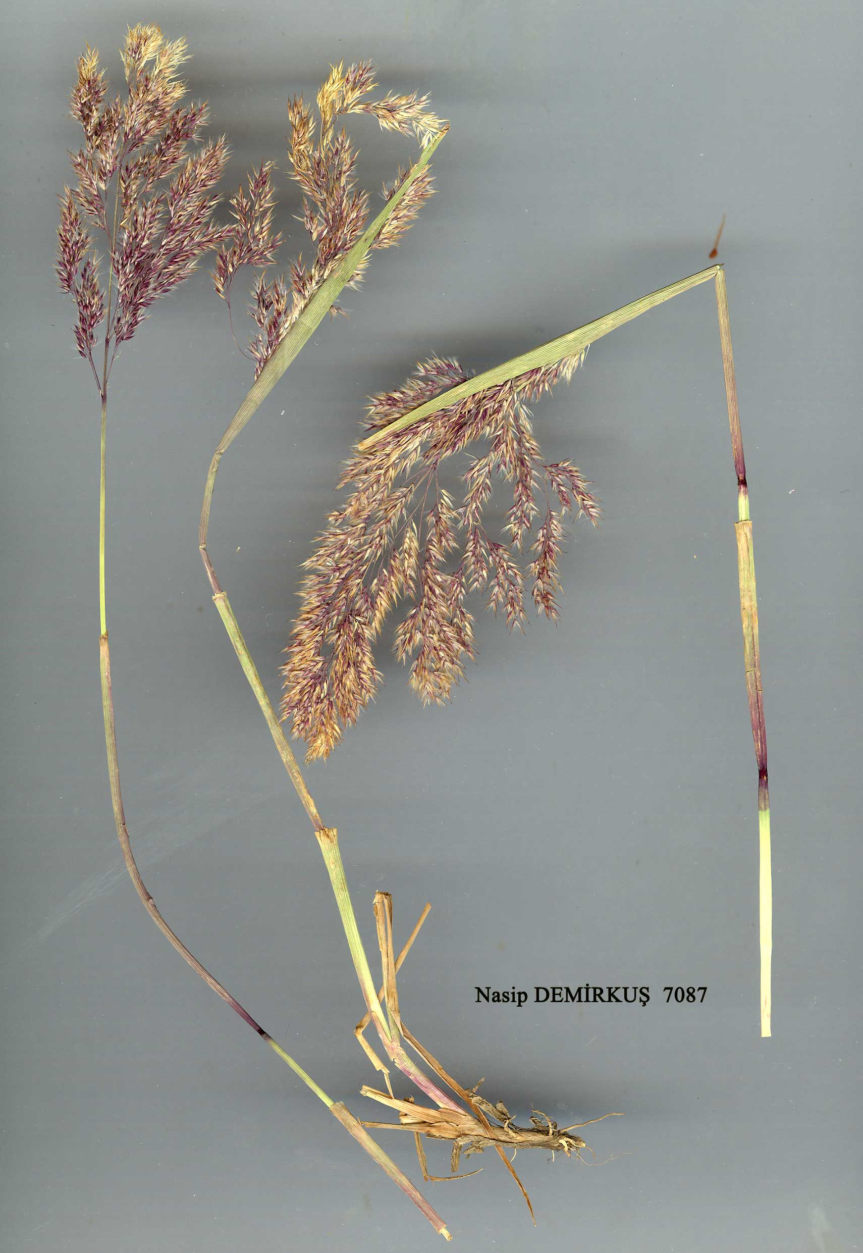 C. epigejos (L.) Roth, Tent. Fl. Germ. 1:34 (1788). Syn: Arundo epigejos L., Sp. Pl. 81 (1753)! Ic: Lowe, Nat. Hist. Brit. Grasses t. 15, A (1891);Hub-bard, Grasses ed. 2:284 (1968). Map 66. Caespitose perennial, with creeping rhizomes. Stems 60-100(-200) cm, erect, rather stout, smooth and glabrous. Leaf sheaths smooth; ligule 4-10(-12) mm, membranous, becoming lacerate; blades 11-40 cm x 4-9 mm, linear, acuminate, flat, glabrous, scabrid on margins, closely veined. Panicle 8-30 x 1.5-6 cm, lanceolate-oblong, dense; branches to 11 cm, aculeolate, patent. Spikelets 5-6(-7) mm, densely clustered, purplish-brown or green. Glumes ± equal, lanceolate, acuminate; lower 1-veined, upper 3-veined. Lemma c. 1/2 as long as glumes, membranous, 3-veined, bifid, with a dorsal or subterminal awn (c. 1-2.5 mm); callus hairs much exceeding lemma. Palea to 2/3 as long as lemma. Anthers 1.6-2.2 mm. Fl. 6-7. Water meadows, mountain slopes, Pinus forests, 465-3050 m. Described from Europe (Hb. Linn. 97/11!). Turkey-in-Europe, N.W., W. & E. Anatolia. A1 (E) Tekirdağ: Saray to Midye, T. Baytop (İSTE 11830)! A2(E) Istanbul: Paşa bahçe to Polonezköy, 19 viii S.E. France, C. Italy, C. Europe, Balkans, C. & S. Russia, Caucasia, Iran, Iraq, Transcaspia, Turkestan, Siberia, E. Asia. Euro-Sib, element. |