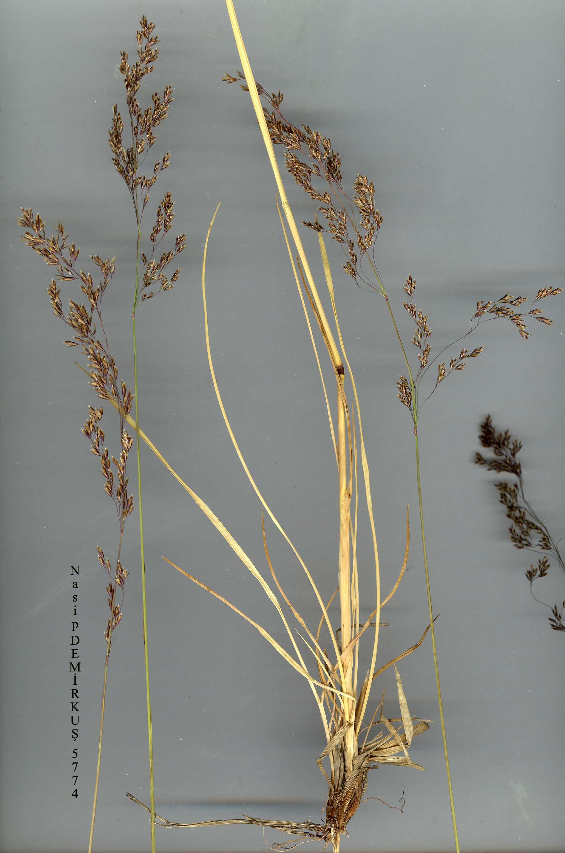 D. caespitosa (L.) P. Beauv., Ess. Agrost. 91 & 160 (1812). Syn: Aira ces-pitosa L., Sp. PL 64(1753)! D. caespitosa (L.) P. Beauv. var. colorata Griseb., Spic. 2:457 (1844)! Ic: Trin., Sp. Gram. 3(22):253 (1829?), as A. caespitosa: Hubbard, Grasses ed. 2:252 (1968). Map 63. Densely caespitose perennial. Stems 28-110 cm, erect or slightly bent at base, smooth. Ligule 3-15 mm, acute. Leaf blades 9-30 cm x 2-5 mm, linear, acuminate, sometimes convolute, green or glaucous, ribbed above, aculeolate on margins and ribs, smooth beneath. Panicle 10-30 x 1.5-29 cm, open, lax, ovate to oblong; branches 2-13 cm, very slender, rough, spreading; pedicels 1-9 mm, smooth or aculeolate. Spikelets 3-6 mm, silvery, purplish or stram-ineous, lanceolate to narrowly oblong. Rachilla prolonged by up to 1/2 length of upper floret. Glumes equalling spikelet or slightly shorter; lower 3-4.2 mm; upper 3.5-5 mm. Lemma 3.1-4.6 mm, enclosed in glumes or their tips pro-truding, rounded on back, oblong, with fine straight awn from just above base; awn 2-4.5 mm, not twisted. Palea slightly shorter than lemma. Anthers 1.5-2 mm. Caryopsis enclosed by firm lemma and palea. Fl. 6-8. Alpine and sub-alpine water meadows and near streams, 1000-3000 m. Described from Europe (Hb. Linn. 85/8!). Widespread. A2(E) Istanbul: Bourounsouy to Djendere (Belgrad forest), 17 vi 1918, Azn.(!). A2(A) Istanbul: Zisso Çiftlik, nr Beykoz, 4 vi 1900,Azn.! A3 Bolu: Abant G., 1350 m, A. & T. Baytop (İSTE 1840)! A4 Kasta-monu: N. side of İlgaz Da., 2100 m", D. 38361! A5 Yozgat: 5 km N.W. of Boğaz Kale, 1000 m, It. Leyd. 1959:1961! A6 Sivas: 5 km from Çat Pinari to Yeniköy, 1600 m, D. 68882(!). A7 Trabzon: d. Maçka, Hamsiköy, Balahor Y, 1650 m, Anşin 533! A8 Rize: Çamlihemşin, Amlakit Y., 2200-2720 m, Güner 1069! A9 Kars: Yalnizçam, 1900m, D. 29662! Bl Balikesir: Kaz Da., 1970, Quezel. B6 Maraş: d. Çardak, Kandil Da., 1800 m, D. 20259! B7 Erzin-can: 48 km from Erzincan to Sivas, M. Tanker (İSTE 5624)! B8 Erzurum: Büyük Ejder Da. S. of Erzurum, 2300 m, Holtz 00.945 et al.! B9 Van: d. Hoşap, Kepir Da., 2900 m, D. 23333! B10 Ağri: Grand Ararat (Büyük Ağri Da.), 2400 m, 11 viii 1910, G. & B. Post 2124 (var. colorata){!). C3 İsparta: mt. Anemas (Anamas Da.), 1980 m, Heldr. (var. colorata). C5 Adana: Karan-fil Da., Bisby B98! C9 Hakkari: 10 km from Hakkari to Kaval (Piyannis), 2400 m, D. 45418! C10 Hakkari: Sat Da. (above Yüksekova), 2700 m, Dun-can & Tait 114! N.W. & C. Europe, Mediterranean area (except E.), Caucasia, Turkestan, E. Asia, N. America. |
