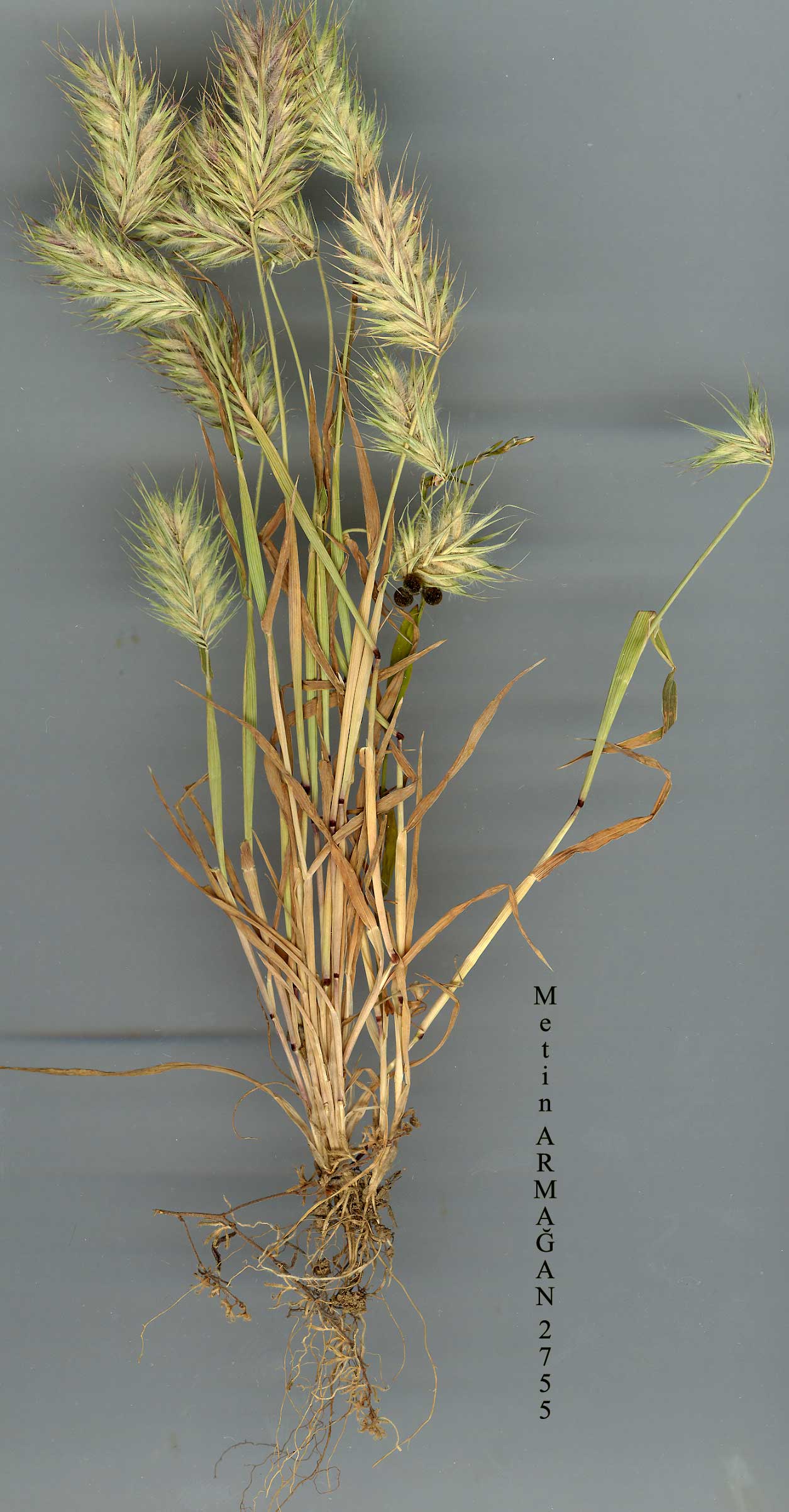 E. distans (C. Koch) Nevski in Acta Univ. Asiae Med. ser. 8b (Bot.) 17:52 (1934). Syn: Agropyron distans C. Koch in Linnaea 21:426(1848) ;A. lasian-thumBoiss., Diagn. ser. 1(13):68 (1853);A. orientale (L.) Roemer & Schultes var. lasianthum (Boiss.) Boiss., Fl. Or. 5:668 (1884)! Ic: Fl. URSS 2: t. 47a ("67a") f. 6a-b( 1934); Fl. Iraq 9: t. 80(1968). Stems to 15 cm. Leaf blades 2-3 mm broad, scabrid or sparsely pilose on upper surface. Spike 2.5-5 cm, oblong, usually partly enclosed in uppermost sheath. Spikelets 15-17 mm, densely villous, with 3-5 florets; rachilla tough. Glumes 7-9 mm, linear-lanceolate, gradually tapering into short awn 4-7 mm. Lemma as long as glumes, with prominent keel and short awn 4-7 mm. Keels of palea prolonged into 2 short awns (0.7-2 mm), with deep cleft between them. Fl. 5-8. Sandy gravel plains, steppe, shaley or igneous slopes in steppe, 850-2500 m. Type: [Soviet Armenia, Erevan] aus der Provinz Eriwan, 915 m, auf basal-tisch-trachytischen Boden, [C. Koch] (holo. B, destroyed). Inner Anatolia. A8 Gümüşane: Bayburt, Bourgeau 254 (with E. orientale)! A8/9 Erzurum: Oltu (Grossheim 1: map 314). A9 Kars: Iğdir to Tuzluca (Aras valley), 920 m, D. 43567b! Erzurum: Karakilise (Grossheim 1: map 314). B4Konya: Janschan(Yavşan) nrTuzG., Andrasovszky 911! B5 Konya: nr Ereğli, 18 v 1902, Zederbauer! B8 Erzurum: nr Erzurum, vi 1853, Huet(with E. triticeumy. B9 Van: 7 km from Van to Erçek, 1850 m, D. 44251! BlO Kars: 3-5 km from Aralik (Aras valley), 850 m, D. 43671! Ağri: 17 km ' N. of Doğubayazit towards Iğdir, 1600 m, Sorger & Buchner 82-62-45! Van: nr Ozal (Özalp?), Sakamoto (Kyoto Univ. Bot. Exped., 1970). C9 Hakkari: 80-86 km S. of Gürpinar, Yalınca to Hakkari, 2500 m, Sorger & Kit-Tan 84-78-19! S.E. Russia, Caucasia, Iran, Iraq, Afghanistan, C.Asia, W.Pakistan. Ir.-Tur. element. |