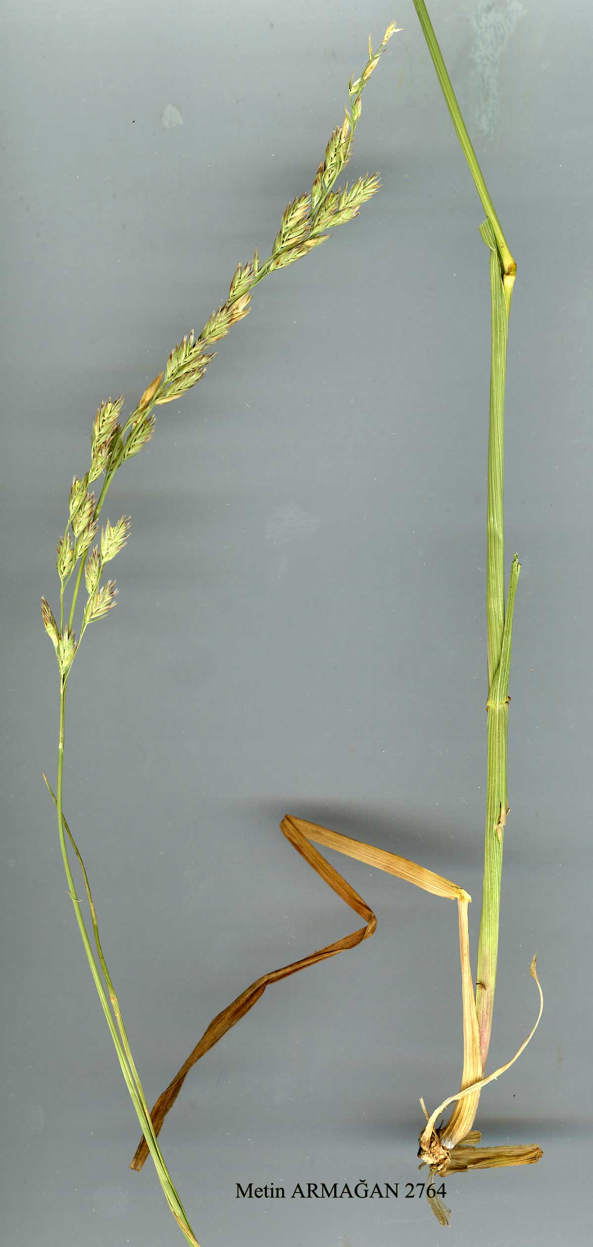 F. arundinacea Schreber, Spic. 57 (1771). Borrill in Cytologia 41:230 (1976). subsp. arundinacea. Syn: F. elatior L. subsp. arundinacea (Schreber) Hackel, Monogr. 152 (1882). Ic: Reichb., Ic. Fl. Germ. ed. 2, 1: t. 140 f. 334 (1850); Hubbard, Grasses ed. 2:144 (1968);F1. Iraq 9: t. 29(1968). Figure 13. Map 78. Laxly caespitose perennial, with few leaves. Stems 30-150 cm, stout, smooth, terete. Leaf sheaths open to base, pale, not decaying into fibres; ligule a low rim with ciliate clasping auricles. Leaf blades flat, subconvolute when dry, rather rigid, 5-10 mm broad;ribs subequal, rounded, prominent for 1/2 their length, with bulliform cells between them; sclerenchyma strands on both sides of all or most veins, reaching them from beneath but not from above. Panicle 10-20 cm, lax, ovate-oblong, nodding at apex, with scabrid branches; lowest node with 2 branches, shorter one bearing usually 3 or more spikelets. Spikelets 10-12 mm, with 4-6 florets. Upper glume acute, 4.3 x 1.8 mm. Lemma ovate-lanceolate, 6.3-8 x 2.2 mm, 2-dentate, awnless or with a short awn not more than 1/4 x lemma. Ovary glabrous. 2n =42. Fl. 6-7. Damp gullies, riversides, water meadows, 300-2100 m. Type: [E. Germany] in prato acclivi hinter dem Biniz, loco humido, Schreber (holo. M). Mainly Turkey-in-Europe, W. & Inner Anatolia; rare E. of 38°E. A2(E) Istanbul: Tuzla, A. Baytop (ISTE 6694)! A2(A) Bursa: Ulu Da., 1800-1900 m, Hub .-Mor. 12512! A4 Ankara: 22 km N. of Ankara, Sorger 73-40-19! A5 Çorum: 42 km from Çorum to Iskilip, Kizil Irmak valley, 600 m, Coode & Jones 1724! A8 Çoruh: 26 km E. of Demirkent, 2100 m, Sorger 81-81-39!' Bl Izmir: Nif Da., 980 m, Buttler & Erben 17334! B3 Afyon: 18 km from Çay to Afyon, 1000 m, Coode & Jones 2379! B4 Ankara: Aksaray, Birand 220! B5 Kayseri: Bünyan, 1380 m, Welsh Pl. Breed. Station Turkey Exped. 1971:Bn954(2n = 42)! B6 Yozgat: d. Akdağmadeni, Gül Da., 1400 m, Ekim & Düzenli 3753! B7 Erzincan: 10 km E. of Erzincan, 1160 m, Welsh PL Breed. Station Turkey Exped. 1971 :Bn 952 (2n = 42)! B8 Erzurum: Erzurum Air-port, 11 vii 1967, J.G. Ross(!). B9 Kars: nr Kötek, 28 vi 1967, J.G. Ross(!). C5 Niğde: N. of Maden, 1830 m, Darrah 439! C1O Hakkari: 10 km from Yüksekova to Şemdinli, 1950 m, D. 45142! Is: Lesvos, Cand. Temperate Eurasia. Sect. Variae Hackel. Densely caespitose perennials with intravaginal innovation shoots. Leaf blades involute, narrow, ovate in cross section (in Turkish species); ligule of variable length, not auriculate. Florets of spikelet not closely imbri-cate, but separated by distinct rachilla segments. Glumes and lemma with scarious margins. Lemma awnless or nearly so. Ovary densely hispid. Cary-opsis oblong, flatly concave ventrally, free from palea; hilum 2/3-3/4 x or nearly as long as caryopsis. |
