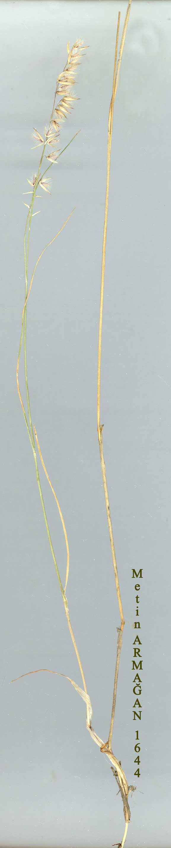M. persica Kunth, Rev.Gram. 1:122, t. 89(1830). Ic: Fl. Pakistan 143:447, t. 47 (1982) — magnifications as given in caption incorrect by a factor of 10. Tufted, erect or ascending perennial. Stems 20-50 cm, often strict. Leaf sheaths glabrous, scabridulous or hairy; ligule 2-5 mm; blades 1-3 mm broad, ± flat or inrolled, glabrous or hairy, suberect, patent or deflexed. Inflorescence a spike-like panicle, continuous or interrupted, often±secund. Spikelets5-10 mm. Fertile florets 1-2. Spikelet 1.5-3 x lower glume; lower glume ovate, upper elliptic-lanceolate, both acute, straw-coloured or violaceous. Lemma of fertile floret ovate, dorsal veins 9, covered with long silky hairs. Sterile florets forming a hollowed clavate mass. Virtually nothing is known about the causes of the puzzling variation within M. persica sensu lato. One might suspect homologous variation, hybridisation, polyploidy, even apomixis, but the species' very wide distribution in Asia would make biosystematic investigation impracticable. A rather broad sub-specific treatment is adopted here; the status of the hairy-leaved variants is particularly problematical. The restricted synonymy cited is mainly of taxa described from Anatolia and which have been checked against Geneva type material. 1. Leaf sheaths and blades glabrous, papillose, scabridulous or minutely puber- ulent; leaf blades erect or divaricate to deflexed 2. Leaf blades minutely puberulent on upper surface, divaricate to deflexed; spikelets 1.5-2 x lower glume, often violaceous; inflorescence usually of interrupted, shortly pedunculate clusters b. subsp. jacquemontii 2. Leaf blades and sheaths glabrous or minutely scabridulous, suberect; spikelets 2-3 x lower glume, usually stramineous; inflorescence ± continuous, with distinctly pedunculate clusters c. subsp. inaequiglumis 1. Leaf sheaths and blades grey-pubescent with deflexed 0.2-0.5 mm hairs; leaf blades suberect to patent (spikelets ± stramineous or violet-tinged) 3. Spikelets 8-9(-10) mm; leaf sheaths and blades (on both surfaces) densely deflexed-pubescent, blades erecto-patent to divaricate a. subsp. persica 3. Spikelets 6-7(-8) mm; leaf sheaths and blades (on both surfaces) shortly deflexed-velutinous; blade suberect d.subsp. canescens b. subsp. jacquemontii (Decne. ex Jacquem.) P.H. Davis, comb. et stat. nov. Syn: M. jacquemontii Decne. ex Jacquem., Voy. Inde 174, t. 175 (1844);M. breviflora Boiss., Diagn. ser. 1(7): 124 (1846)! M. armena Boiss. & Kotschy ex Boiss., Fl. Or. 5:590 (1884) pro syn.! M. cupani Guss. var. breviflora (Boiss.) Boiss., Fl. Or. 5:590 (1884)! Map 99. Fl. 7-8. Rocky limestone slopes and ravines, igneous slopes, steep meadows, 1750-3050 m. Type: [?Kashmir] in schistosis mobilibus aridis a Kanum ad castra juxta altissimos vicos, Jacquemont (holo. P). E. Anatolia. B6 Maraş: Berit Da., 2745 m, 10 viii 1865, Hausskn. (as M. jacquemontii Decne. subsp. anatolica Hempel var. anatolica, ined.)! B7 Erzincan: Keşiş. Da. above Cimin, 2800-2900 m, D. 31784! B9 Van: Artos Da., above Gevaş, 2440 m, D. 22766! C2 Antalya: Elmali, Bourgeau 622 (as M. trachyantha Boiss.)! C6 Maraş: Berit Da., Kotschy 338 (M. armena pro syn., spikelets stramineous)! C10 Hakkari: Cilo Tepe, 3050 m, D. 24095! Sat Da. nr Varegöz, 1750-1900 m, D. 45722! Soviet Armenia, Talysh, Iraq, Iran eastwards to Tien Shan. Ir.-Tur. element. |