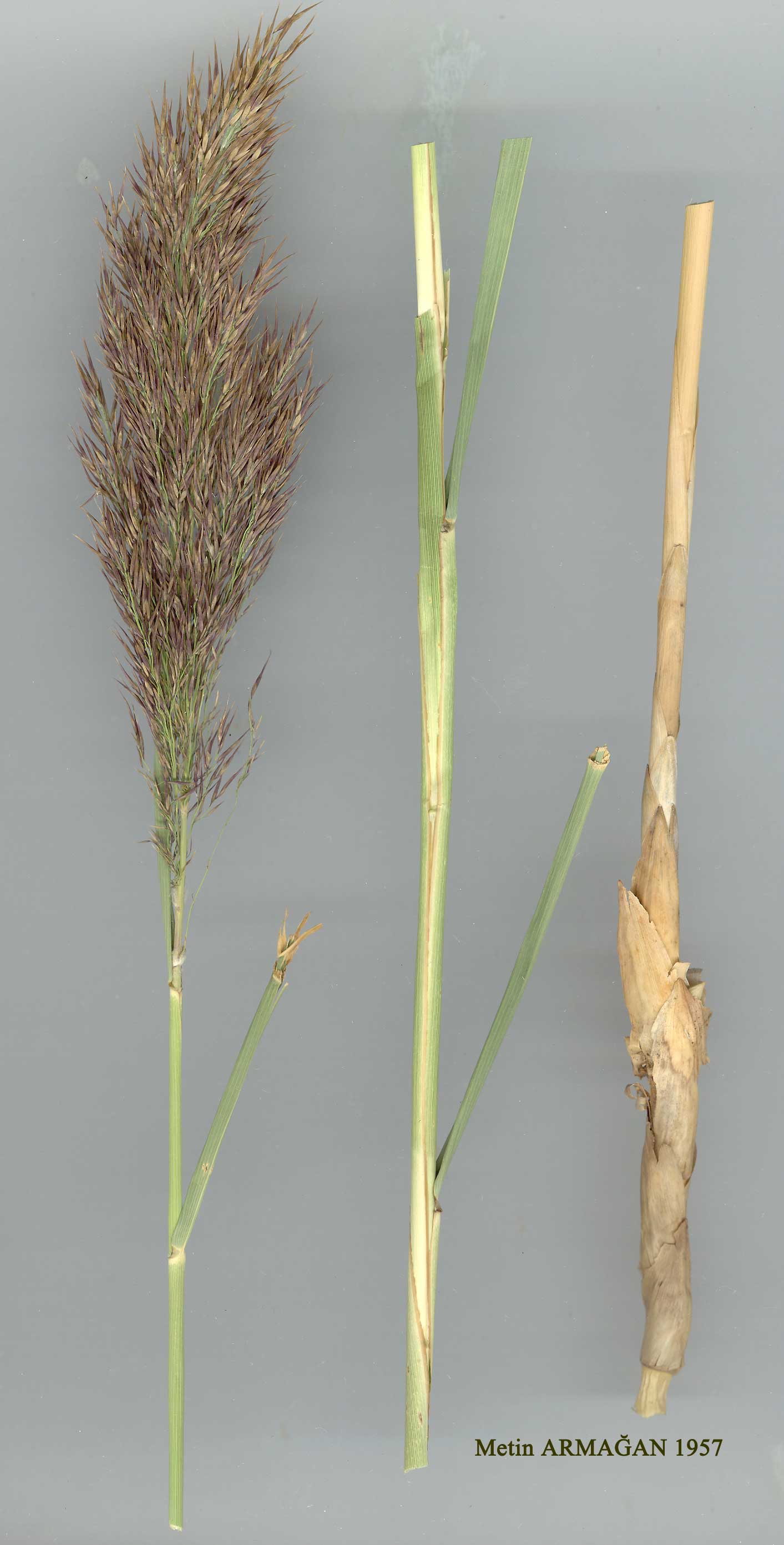 | P. australis (Cav.) Trin. ex Steudel, Nom. ed. 2, 2:324 (1841). Syn:Arundo australis Cav. in Ann. Hist. Nat. 1:100 (1799); Phragmites communis Trin., Fund. Agrost. 134(1820). Ic: Fl. Iraq 9: t. 143 (1968); Hubbard, Grasses ed. 2:348 (1968), as P. communis; Polunin, Fls. Europe no. 1740 (1969), as P. communis. Perennial. Stems to 3 m, usually simple. Ligule a dense fringe of hairs, 0.5-1 mm, when young also with a row of erect hairs to 1 cm on dorsal surface. Leaf blades contracted at base, to 60 x 3 cm, tapering to a long fine apex, scabrid on margins. Panicle to 40 cm, hairy at bases of fascicles. Spikelets 3-6-flowered. Glumes unequal, glabrous; lower ovate, acute, 3-4 mm, upper ovate-lanceolate, acute, 5-6 mm. Lemma narrowly lanceolate, long-pointed, 9-10 mm, lowest lemma twice as long as upper glume. Hairs on rachilla 7-9 mm. Anthers 1-1.7 mm. Fl. 8-10. Lakes, rivers, ditches, swamps, fens, canal banks, seashores, s. 1.-2400 m. Based on a specimen collected near Port Jackson, Australia, in 1799 by Cavanilles (hob. MA). Widespread. A1(E) Tekirdağ: 10km W. of Inecik, A. Baytop (ISTE 12447)! A 1(A) Balıkesir: Marmara adasi, S. side, A. Baytop (ISTE 13812)! A2(E) Istanbul: Florya, 18 x 1896,Azn.! A2(A) Kocaeli: izmit,Kirazdere,s.l., A. Baytop (ISTE 18569)! A3 Bolu: Abant G., 1350 m, A. Baytop (ISTE 18442)! A4 Bolu: ÇağaG., between Gerede and Bolu, 1150 m, D. 39031! A5 Kastamonu : Taşköprü, 600 m, A. Baytop (İSTE 38188)! A8 Rize:Ikizdere, Başköy (Çimil), Cermanin Y., 2400 m, D.21024! A9Kars: Çildir G., T. Baytop (İSTE 18332)! A10Kars: N.of Orta Alican, 800m, Sorger & Kit-Tan84-72-66(1). Bl Manisa: Akhisar, Bağda (İSTE 1041)! B2 Kütahya: Murat Da. below Hamam, 1350 m, Çirpici (İSTE 41466)! B3 Afyon: 6 km from Çay to Bolvadin, A. Baytop (ISTE 33986)! B4 Konya: Cihanbeyli, Boluk G., 1010 m, Khan et al. 449! B6 Malatya: 10 km from Darende to Malatya, 970 m, A. Baytop (ISTE 37745)! B/C7 Urfa/Elaziğ: Urfa to Elaziğ, Hand.-Mazz. B8 Erzurum: Aşkale, 1625 m, A. Baytop (İSTE 33587)! B9 Bitlis: Nemrut Da., 2250 m, Spencer 0103! B10 Kars: 8-12 km E. of Iğdir D.Ü.Ç., 800 m, D. 43846! Cl Izmir; 5 km to Selçuk, S. & V. Başaran (İSTE 38891)! C2 Muğla: Marmaris, Ölü boğazi, T. Baytop (ISTE 38835)! C3 Burdur: Bağasary to Kesik, Önür (ISTE 38893)! C4 Konya: 10 km from Konya to Ereğli, 1030 m, A. Baytop (ISTE 3748I)! C5 Niğde: 14 km from Çamardi to Solakli, 1340 m, A. Baytop (ISTE 37541)! C6 Adiyaman: Gölbaşı, 870 m, A. Baytop (ISTE 37790)! C9 Hakkari: Zab gorge nr Kalolans, D. 23859! C10 Hakkari: Yüksekova, 1950 m, Duncan & Tait 214! Is: Lesvos, Rech. 5706; Rodhos, 300 m, Fiori 51. Temperate Eurasia, extending into the tropics. Euro-Sib, element. The Common Reed (in Turkish, 'kamiş') propagates quickly and forms large stands in swamps and other wet places. The leafy stems are used for roofing purposes. Var. stenophylla (Boiss.) Bor, with narrower, convolute leaves, has been recorded from Bl Izmir (Izmir, Kotschy!) and B4 Ankara (S.W. side of Tuz G., Wag-enitz & Beug 324!). It must be regarded as a variant adapted to dry or saline habitats. Such variants are often met with on the dry sandy banks of large canals, while in the watery bed of the canal the plants are much taller and have broader flat leaves (e.g. B3 Eskişehir: 10 km from Kaymaz to Çifteler, 850 m, A. Baytop ISTE 38739!). |