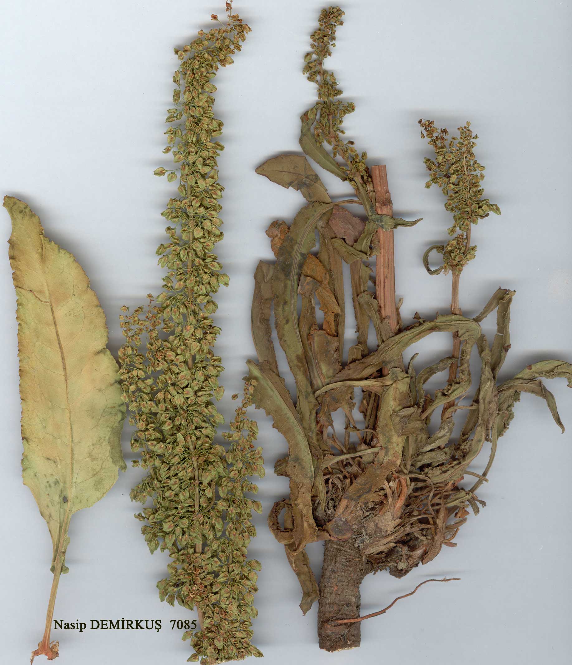 | R. crispus L., Sp. PI. 335 (1753). Ic: Reichb., PL Crit. 5: t. 576 (1828). Figure 7, p. 283. Perennial up to 150 cm. Basal leaves narrowly lanceolate to oblanceolate, more than 3 x longer than broad, acute. Petioles canaliculate above. Inflorescence dense. Pedicels longer than the fruiting perianth segments, articulate below the middle. Fruiting perianth segments cordate to triangular, at least one tuber-culate, 4-5 x 3-4 mm. Fl. 5-8. Banks, marshes, waste places, S./.-2300 m. Described from Europe (Hb. Linn. 464/7!). A1(A) Çanakkale: Dardanelles, Sint. 1883: 873! A2(E) Istanbul: Şişli, 7 v 1889, Azn.! A2(A) Istanbul: Maltepe to Soğanlik, 9 vii 1912, Azn.! A3 Bolu: Ala Da., Kühne 1222! A5 Kastamonu: Tosya, Sint. 1892: 4342. A8 Çoruh: Artvin, 650 m, D. 30013! A9 Kars: SW slope of Kisir Da., 2300 m, D. 30552! B2 Izmir: Boz Da., Bal. B4 Ankara: Beynam, D. 13006! B7 Tunceli: Pülümür to Selepur, 1900 m, D. 31580! B9 Diyarbakir: Diyarbakir to Bitlis, 750 m, McNeill 515! C4 Konya: Küçük Köy, 980 m, Helbaek 2668! C6 Gaziantep: Gaziantep, G. Post. Naturalised in most parts of the world. |