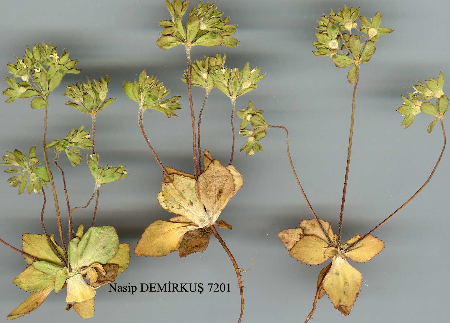 A. maxima L., Sp. Pl. 141 (1753). Ic: Hegi, Ill. Fl. Mittel-Eur. 5(3) : ]810 f. 2816(1927). Erect annual, 1-15 cm. Leaves 3-35 x 2-20 mm, elliptic to broadly ovate, ± parallel-nerved, margin remotely and bluntly denticulate, glabrous or sparsely hairy. Scapes with an indumentum of simple often crisped white hairs and minute glandular hairs. Inflorescence (l-)2-9(-15)-flowered. Bracts 3-20x1-9 mm, foliaceous, elliptic to obovate, equal to or longer than pedicels, seldom shorter. Pedicels equal or not. Calyx 4-14 mm, ± hirsute, lobes equalling or longer than tube. Corolla included in calyx, white to pink. Capsule 2-6 mm. Fl. 4-5. Limestone or igneous rocks and screes, gravel sand or clay steppe, open Pinus woods, cultivated or fallow fields, 300-1850 m. Described from France (Hb. Linn. 197/1, 2, photo!). Mainly Inner, W. & S. Anatolia. A1(E) Edirne: Edirne, Nejčev. A3 Bilecik: S. of Bilecik station, 400 m, D. 42070! A4 Ankara: Çubuk De., 900 m, v 1936, Krause & Birand. A5 Samsun: Vezirköprü. Kizilirmak, 400 m, Tobey 2426! A6 Tokat: Tokat, 600-700 m, Borum. 1893:3433! A7 Gümüşane: Daltaban, Sint. 1894:5430! A8 Çoruh: (Grossheim 7: map 185). A9 Kars: Gölebert nr Ardahan, 1800 m, D. 30422! B1 Manisa: Manisa Da., c. 900 m, Lewejohann (TU-74-071) & Holtz! B2 Kütahya: 21 km S.W. of Kütahya, 960 m, Hub.-Mor. 14359. B3 Eskişehir: Eskişehir to Seezora(?), Scheibe 1261! B4 Ankara: c. 70 km from Ankara to Konya, 1100 m, Coode & Jones 88! B6 Maraş: Mehmet Bey, 10 km N. of Göksun, 1300 m, D. 27606! B7 Elaziğ: Gölcük, 1190 m, E.S.Brown 2444! B8 Erzurum: Erzurum, Tchihatcheff; 'Armenia', Calvert & Zohrab! B9 Van: 7 km from Van to Erçek, 1850 m, D. 44342! B10 Ağri: 18 km from Doğubayazit to Iğdir, N. side of Pamuk Da. pass, 1850 m, D. 43549! C2 Aydin: below Karacasu, 400-500 m, D. 41646! C3 Burdur: Burdur G., vi 1845, Heldr.! C4 Içel: Mut, Mağras Da. summit, 1400 m, Coode & Jones 782! C5 Içel: Dumbelek pass, Siehe 1911:413! C6 Gaziantep: Dülük Baba N. of Gaziantep, 1000 m, D. 27936! C. & S. Europe, N.W. Africa, C. & S. Russia, Siberia, Caucasia, Iran, Iraq, W. Syria to Afghanistan and Soviet C. Asia. Formal varieties of A. maxima have often been recognized, based on relative length of bracts and pedicels, on characters of indumentum and calyx and on flower colour and size. In addition to these characters the specimens studied from Turkey show considerable variation in the shape of the bracts and in the degree to which their bases are connate and/or saccate, in the shape of the corolla lobes and the length of the corolla tube. As these characters do not appear to be correlated, no variant warrants formal recognition. |