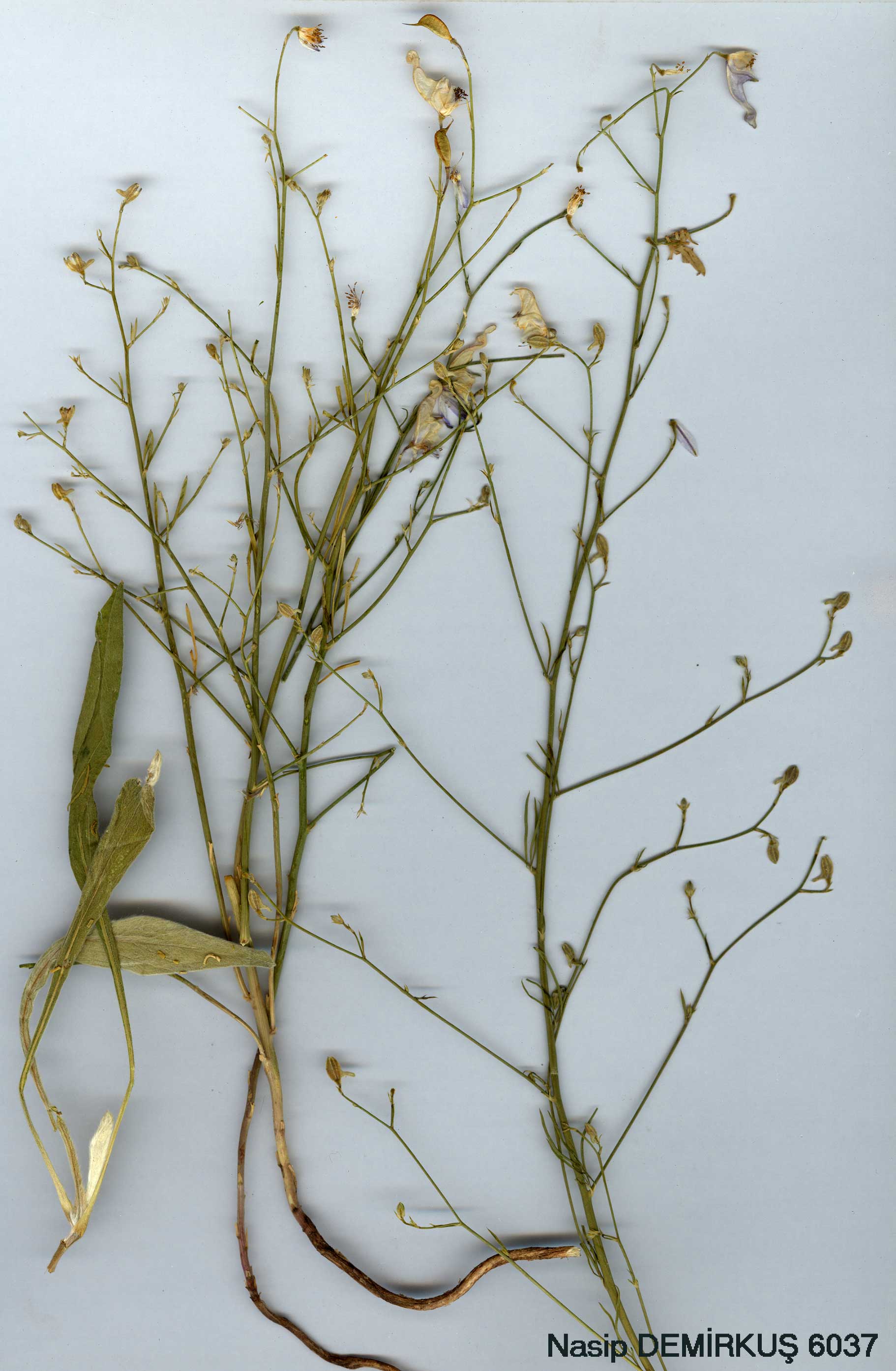 C. hohenackeri (Boiss.) Grossh., Fl. Kavk. 2: 101 (1930). Syn: Delphinium hohenackeri Boiss., Fl. Or. 1: 85 (1867)! Aconitopsis hohenackeri (Boiss.) Kem.-Nath. inTrudilnst. Bot. Tbilisi 6: 125 (1940)! I?: Flora Gruzia 4: t. 134(1948). Figure 1, p. 127. Map 20, p. 121. Plant up to 50 cm, adpressed pubescent or glabrescent, ultimate branches rather slender. Leaf laciniae linear, acute. Flowers lilac-blue (eventually drying yellowish), 18-25 mm. Corolla 5-lobed; upper lobe shortly bifid or entire, ± equal and approximate to the very obtuse intermediate lobes; lateral (lower) lobes oblique, broad, obtuse, separated from the intermediate lobes by a wide sinus; spur apex circinately involute. Follicle semi-obovate, 7-9 x 3-4 mm, apex sub-gibbous, abruptly rostrate. Fl. 6-8. Dry slopes, fields, 900-1600 m. Syntypes: [Turkey] prope Erzeroum, Calvert (G! E!); Baibout (Bayburt), Bourgeau (G! E! K!); Cappadocia ad Euphratem, Aucher 65 (G! K!); [Azerbaijan], prov. Talysch, Hohenacker. N.E. Anatolia. A7 Gümüşane: Gümüşane, 1000 m, Balls 1441A! A8 Gümü-şane: Mt. Ceok nr. Bayburt, Bourgeau 7! Erzurum: Tortum G., 1100 m, Stn. & Hend. 6092! Çoruh: Lomaschennr. Artvin, Andronakai 178! A9 Çoruh: Ardanuç to Kordevan Da., 900 m, D. 30076! Transcaucasia, N., N.W. & W. Iran. Ir-.Tur. element. Apparently darker-flowered than its allies. |