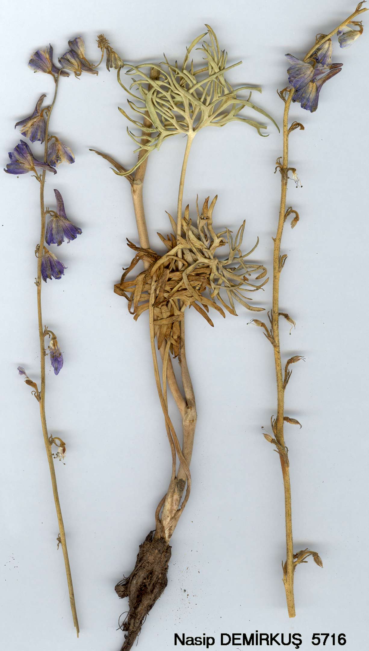 D. cyphoplectrum Boiss., Diagn. ser. 1(6): 7 (1845). Slender perennial, 25-60 cm, upper part of stem crisply puberulent, glandular-pubescent or glabrous. Stem flexuose, terete, striate. Median cauline leaves long-petioled with narrowly vaginate bases, 3-10 cm across, multisect into linear laciniae. Raceme linear, lax, 2-3.5 cm broad. Bracts linear-lanceolate, much shorter than pedicels; bracteoles similar, attached near base of pedicels, rarely median. Flowers varying from deep violet-blue to dirty white, 16-24 mm; sepals widely spreading; petals ± exserted; spur about as long as sepals, tapering and subacute or ± cylindrical, obtuse or subsaccate. Follicles pubescent or glabrous. Three varieties can be provisionally recognised in Turkey: 1. Inflorescence crisped-puberulent; spur tapering, subacute; flowers 16-20 mm, dusky violet var. stenophyllum 1. Inflorescence glandular-pubescent or glabrous; spur ± cylindrical, obtuse or subsaccate; flowers 20-24 mm 2. Flowers deep violet-blue; laciniae of median leaves less than 1 mm broad var. vanense 2. Flowers whitish; laciniae of median leaves broader var. pallidiflorum var. pallidiflorum (Freyn) Davis in Notes R.B.G. Edinb. 26: 171 (1965). Syn: D. pallidiflorum Freyn in Bull. Herb. Boiss. ser. 2, 1: 254 (1901). Steppe and rocky places, 1900-2400 m. Type: [Turkey B9 Van] Warak Dagh (Erek Da.), 2700 m, 27 vi 1899, A. Kroneburg 166. S.E. Anatolia. B9 Van: Çuhgediği pass, between Hoşap and Başkale, 2340-2370 m, Hub.-Mor. 10948! D. quercetorum Boiss. & Hausskn. (described from N. Iraq) is probably synonymous, the plant showing considerable variation in indumentum, spur shape and bracteole position. D. cyphoplectrum is a very polymorphic, Irano-Turanian species, widespread in parts of Iran, Transcaucasia and N. Iraq. D. talychensis Tzvel. and D. nachic-zevanicum Tzvel. (recently described from Transcaucasia) are conspecific with D. cyphoplectrum as interpreted here, which evidently comprises a series of variable geographical races which need further study. It is not clear to me whether D. cyphoplectrum sensu stricto is specifically distinct from D. tuberosum Aucher ex Boiss. which has been collected at the locus classicus of D. cyphoplectrum in Iran and provides an earlier name. |