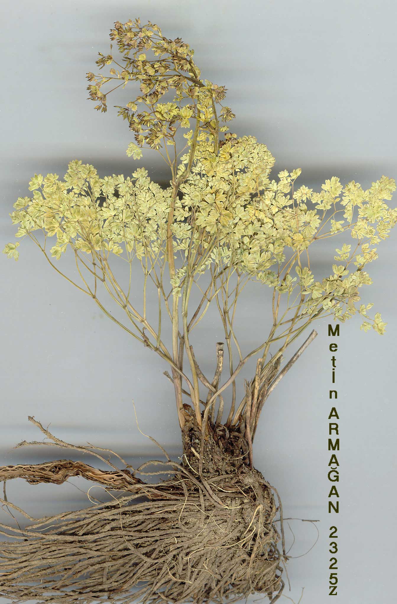 T. isopyroides C. A. Mey. in Ledeb., Fl. Alt. 2: 346 & t. 397 (1830). Ic: Fl. Armenia 1: t. 63 (1954). Subscapose, very glaucous, glabrous herb. Leaves triangular in outline, the two lateral divisions as large as the middle division. Ultimate segments elliptic, entire or lobed, not more than 7 mm. Inflorescence a raceme or panicle, the peduncles much exceeding the bracts, elongating considerably in fruit, arcuate-spreading. Stigma sagittate with an irregular margin. Achenes oblong-fusiform, strongly ribbed, 5-6 mm. Fl. 5. Rock ledges, 1100-1800 m. Type: [U.S.S.R.] in rupestribus montium Urmuchaika prope Buchtarminsk, Meyer. Scattered, mainly in E. Anatolia. A7 Gümüşane: Gümüşane, 1300 m, Stainton 8338! B4 Ankara: Çankaya, Görz. B6 Sivas: Gürün to Pinarbaşi, 1800 m, D. 21994! Maraş: Elbistan, 1100 m, D. 27626! B7 Erzincan: Egin (Kemaliye), Sint. 1890: 2216! C5 Seyhan: Pozanti to Bürücek, 20 v 1952, Akbaş! C5 Malatya: Erhenek (Doğanşehir to Pazarcik), 1200 m, D. 27739! C8 Mardin: above Terek, Hausskn. Soviet Armenia, N. Iraq, Syrian Desert, Iran, Afghanistan, Altai. Mainly in the Ir.-Tur. region. |