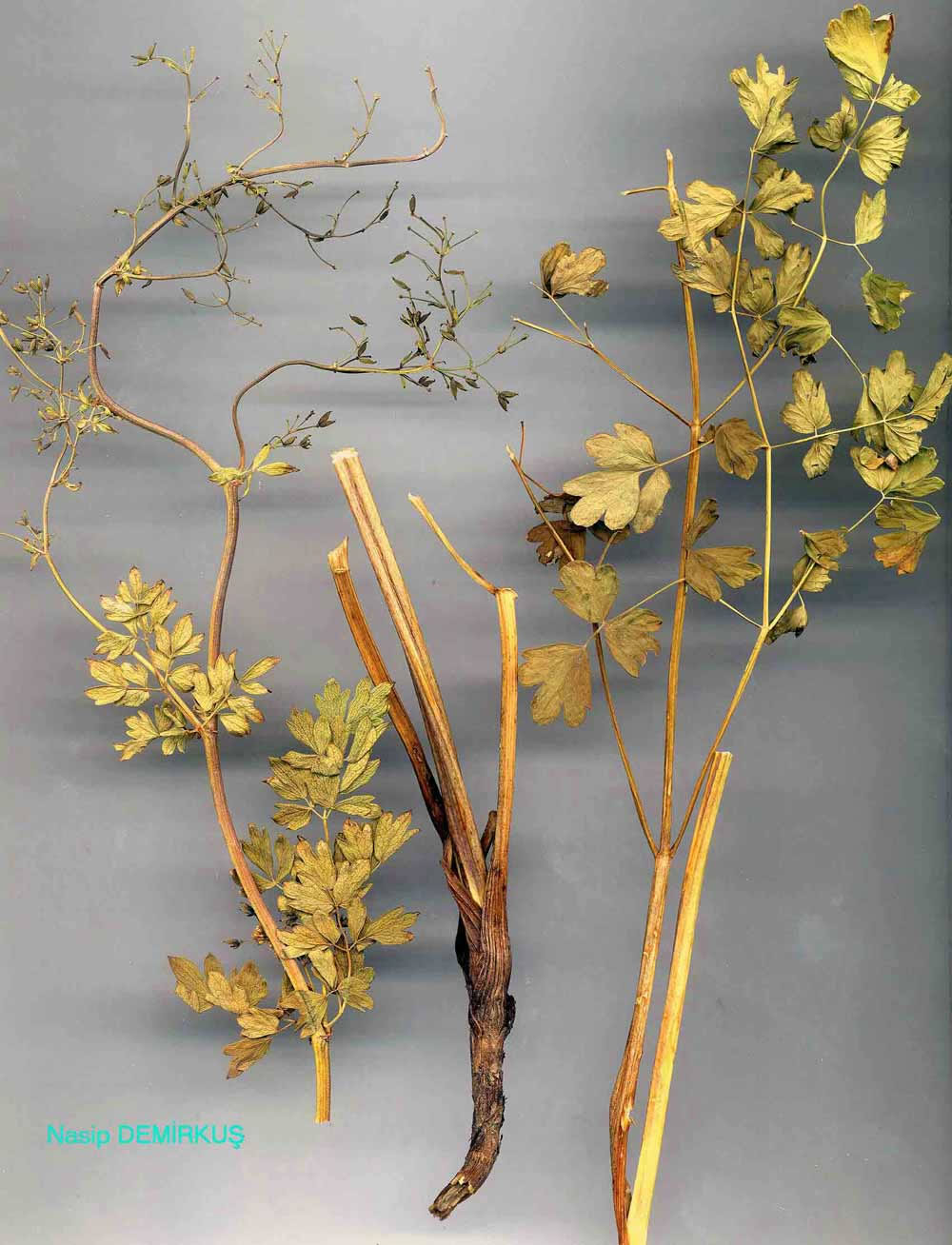 | T. minus L., Sp. Pl. 546 (1753). Usually glabrous herbs, green or slightly glaucous. Stems erect, up to 100 cm. Leaves ± triangular in outline, the two lateral divisions almost as large as the middle division. Ultimate segments very variable. Inflorescence a dense to lax panicle. Stigma not fimbriate. Achenes fusiform, ribbed, not compressed.A complex species which has been divided into many subordinate taxa. Three taxa, which are often difficult to distinguish, are recognisable in Turkey. The following account is only provisional, and further work on the complex is necessary. 1. Largest ultimate leaf segments less chan 9 mm; plants usually erect and strict var. microphyllum 1. Largest ultimate leaf segments more than 9 mm; plant usually not strict 2. Inflorescence lax, its lowest branches arising at about the middle of the stem var. majus 2. Inflorescence compact, its lowest branches arising in the upper part of the stem var. minus var. minus. Syn: T. minus sensu Boiss., Fl. Or. i: 8 (1867) pro parte. Ic.: Ross-Craig, Draw. Brit. Pl. 1: t. 3-5 (1948). Fl. 6-7. Damp meadows, 1800-2200 m. Described from Europe (Hb. Linn. 713/12 photo.!). Scattered. A6 Sivas: Zara to Şerefiye Y., 1550 m, Hub.-Mor. 14308! A8 Erzurum: Kop Da., Aşkale to Bayburt, 2000 m, Hub.-Mor. 10962! A9 Kars: Sari-kamiş, 2100 m, D. 30771! B3 Bilecik: Bozujuk (Bözüyük), 1929, Bernhard. B6 Kayseri: Sariz to Pinarbaşi, 1600 m, Hub.-Mor. 10961! Maraş: d. Göksun, Binboğa Da., 2200 m, D. 20002! C4 Içel: Gülnar to Ermenek, 1400 m, Hub.-Mor. 10402! Hub.-Mor. 10403 (from Içel: W of Gülnar, 915 m) agrees with subsp. minus but is very glandular. This may represent a new taxon. |