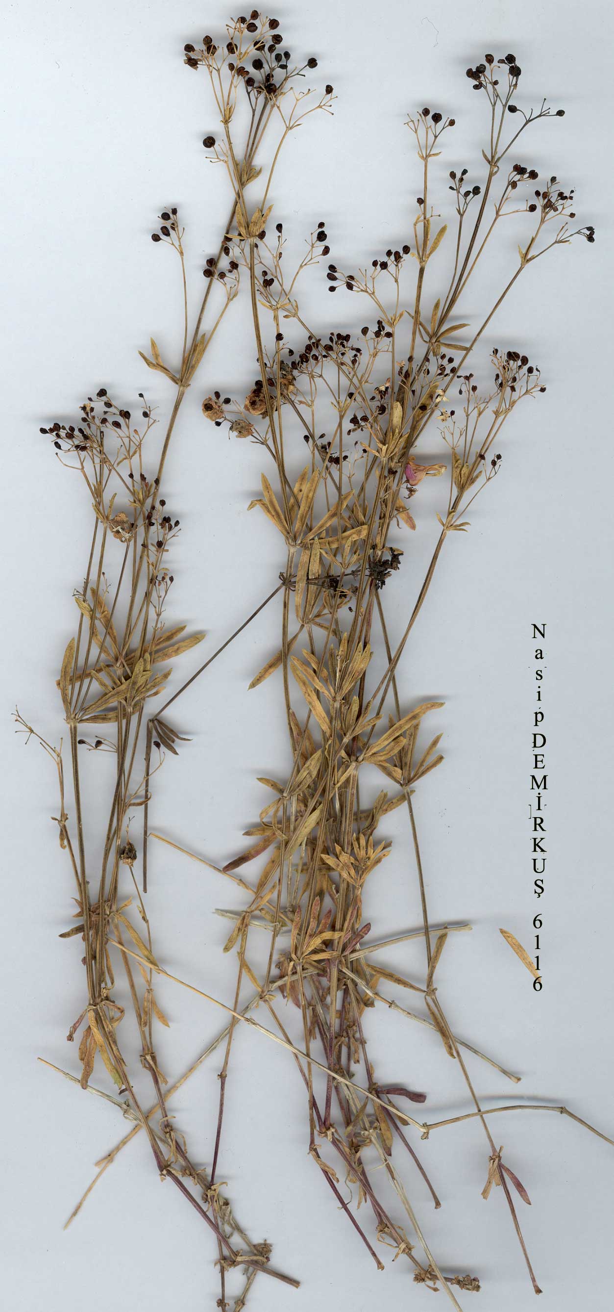 G. subvelutinum (DC.) C. Koch in Linnaea 24:465 (1851). Syn: Asperula subvelutina DC, Prodr. 4:585 (1830); G. subvelutinum (DC.) C. Koch subsp. subvelutinum sensu Ehrend. in Notes R.B.G. Edinb. 22:368 (1958) p.p. Figures 25 & 27. Map 112. Perennial with rootstock and herbaceous or ± woody stem bases. Stems 15-25 cm, ascending, lax or suberect, ± stiff, often branched, densely pubescent in lower 1/2, more sparingly to glabrescent above; lowest 1-2 internodes short, ± equalling leaves, middle and upper few, elongate to 6 cm. Leaves in whorls of 6, ± erect to somewhat spreading, 10-20 x l-2(-2.5) mm, linear-oblong, obtusish to acute, densely puberulent, with inconspicuous vein. Thyrses short, ± ovoid, with corymbiform cymes consisting of subfasciculate flowers, very sparingly puberulent to glabrous. Lowest bracts leaf-like, pubescent, upper reduced, finely puberulent to glabrous. Pedicels thin, 1.5-4 mm. Corolla white, (2.5-)3-4.5(-5) mm; tube 0.3-0.6 mm,lobes ovate-oblong, obtusish to subapiculate, 1.2-2(-2.5) mm, often hairy outside. Anthers lenticular to ellipsoid, 0.3-0.5 mm, yellowish. Ovary sometimes sparingly hairy. Mericarps broadly ellipsoid, 2-2.5 mm, subgranulate, ± glabrous. Fl. 6-7. Rocky slopes, scree, 2100-3000 m. Type: [Iran] in Persia ad montem Elwind, Olivier & Bruguiere (holo. G—DC, photo!). S.E. Anatolia; rare. B9 Van: Artos Da., c. 3000 m, D. 22823! N, side of Erek Da., above Değirmenköy, 2100-2250 m, D. 44454! road from Hoşap to Başkale, N. side of Çuh pass, 2900 m, 9 vii 1951, Simon! C10 Hakkari: Sat Da., between Varegöz and Sat G., 2900-3000 m, D. 45586! Georgia, Iran. Ir.-Tur. element. In the N. parts of the area, aberrant glabres-cent to glabrous forms with large corollas (to 4.5 mm diam.) occur, e.g. D. 22823 and D. 44454; they appear to approach G. nabelekii. |