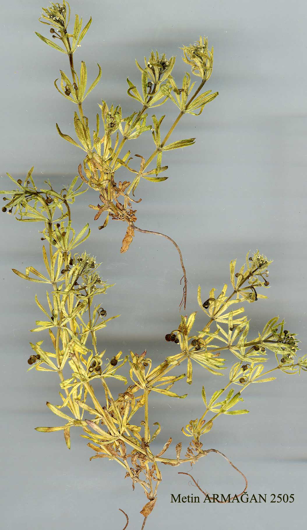 G. tricornutum Dandy in Watsonia 4:47 (1957). Syn: G. tricorne Stokes in With., Bot. Arr. Brit. PL, ed. 2, 1:153 (1787) p.p.; G. pisiferum Boissieu in Bull. Soc. Bot. Fr. 43:285 (1896) non Boiss. (1849). Ic: Sowerby, Engl. Bot., ed. 3,4: t. 659(1865). Annual, 10-60(-100) cm, with scrambling, flaccid, quadrangular, retrorsely scabrid stems. Leaves in whorls of 6-8, 10-30(-35) x (1.5-)2-4(-8) mm, linear-oblanceolate to oblanceolate, long-acuminate, with retrorsely (at apex an-trorsely) aculeolate flat margins and midrib, glabrous on both surfaces. Thyrses elongate, axillary cymes l-5(-7)-flowered, usually scarcely longer than leaves, sometimes distinctly longer. Peduncles (5-)8-15(-20) mm; pedicels 1-8 mm, stout and curved downwards and inwards after flowering. Central flowers hermaphrodite, lateral male. Corolla white, cup-shaped, l-2(-2.5) mm diam., with ovate-oblong, acute lobes. Mericarps single or paired, 2.5-5(-6) mm, densely covered with acute verruculae. Fl. 4-6(-7). Cultivated and waste ground and other dry, open habitats, 10-1800 m. Described from the Isle of Wight, England. Widespread. A1(E) Çanakkale: 25 km N. of Gelibolu, 10 m, Sorger 68-2-22! A2(A) Istanbul: Antigoni, 29 v 1909, Wimmer 197! A3 Bolu: 26 km E. of Bolu, W. of Gerede, 980 m, Uotila 19964! A4 Ankara: 22 km N.W. of Ankara, 900 m, Sorger 71-62-21! A5 Çorum: 5 km from Çorum to Merzifon, 800 m, Coode & Jones 1823! A6 Tokat: 15 km S. of Tokat, on road to Sivas, 14 vi 1939, Reese! A7 Trabzon: nr Trabzon, 30 m, Hand.-Mazz. 296! A8 Çoruh: above Artvin, 850 m, D. 30021! A9 Kars: Kars to Susuz, 1800 m, D. 29583! Bl Izmir: above Bornova, 8 v 1931, Reese! B3 Afyon: 27 km S. of ■ Emirdağ on road to Bolvadin, 1100 m, Coode & Jones 2340! B4 Ankara: 42 km N.W. of Kulu, 1000 m, Sorger 73-2-21! B5 Niğde: nr Ovacık, 1400 m, Siehe 1898:108! B7 Sivas: Divriği, Demir Da., T. Baytop (ISTE 12998)! C2 Denizli: Honaz Da., 1200 m, Sorger 64-51-18! C3 Burdur: 40 km S. of Burdur, road to Antalya, Sorger 63-42-23! C4 Konya: 21 km N. of Karaman, 1000 m, Sorger 66-36-33! C6 Hatay: above Iskenderun, 100-300 m, D. 26968! C7 Urfa: 22 km from Urfa to Viranşehir, 500 m, D. 42298! (see note below). C8 Mardin: 10 km from Gercüş to Hasankeyf, 700-800 m, D. 43016! Is: Lesvos, Cand.; Khios, Orphanides; Samos, Rech. 3648; Rodhos, Danish Exped. S., W. & C. Europe, Caucasia, Iraq, Iran, C. Asia to Kashmir, Tibet; introduced elsewhere. Medit. element. The following plants from E. Anatolia are remarkable for their large mericarps to 6 mm and peduncles up to twice as long as leaves: D. 28006 from C6 Gaziantep: Kizilhisar De. between Gaziantep and Kilis and D. 42298 (see above). |
