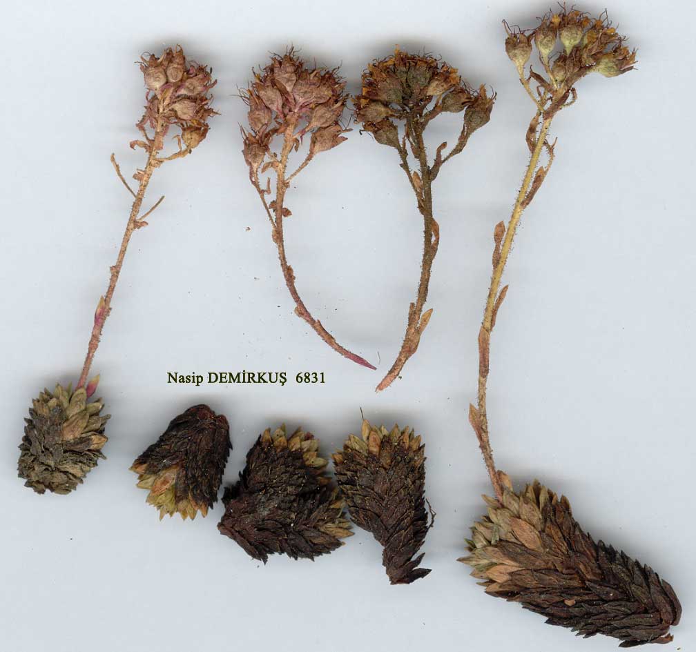 | S. kotschyi Boiss., Diagn. ser. 2(2): 65 (1856). Caespitose perennial, forming cushions up to 45 cm diam. Leafy shoots columnar, with the previous years' tightly imbricate dead leaves remaining. Leaves linear-oblong, ± acute, glaucous, lime-encrusted, ciliate at base. Flowering stems 1-6 cm, bearing 4-10 flowers. Pedicels 4-10 mm. Calyx glandular-hairy. Petals yellow, 4-5 mm, c. 2 x as long as sepals but shorter than stamens. Ovary semi-inferior. Fl. 5-9. Limestone rocks, 1300-3650 m. Type: [Turkey C5] in Tauro Cilicico, 1859, Kotschy (iso. K!). Widespread but local; absent in the W. A4 Kastamonu: Ilgaz Da., 2140 m, D. 21550! A5 Amasya: Ladik to Akdağ, 1300 m, Tobey 991 ! A7 Gümüşane: Cour- coulizos, above Gümüşane, Bourgeau. B6 Sivas: 48 km from Gürün to Pinarbaşi, 2300 m, Stn. & Hend. 5686! B7 Erzincan: Sipikör Da., 2400 m, Balls 278! B9 Van: Artos Da., 3650 m, D. 22885a! B9/C9 Van: d. Başkale, Ispiriz Da., 3400 m, D. 23705! C3 Antalya: d. Gebiz, Bozburun Da., 1600 m, D. 15510! C5 Niğde: Ala Da., upper Narpiz gorge, 2500-3000 m,Parry 95! C6 Maraş: BeritDa., 2900 m, Balls 1084! C9 Hakkari: Cilo Da. in Diz De., 1750 m, D. 24000(shade form)! C10 Hakkari: Mor Da., 2750-3600 m, Watson et al. 3634! N. Iran. S. kotschyi may possibly occur in Greece (see Fl. Europaea 1:378, 1964), but the record needs confirmation. |