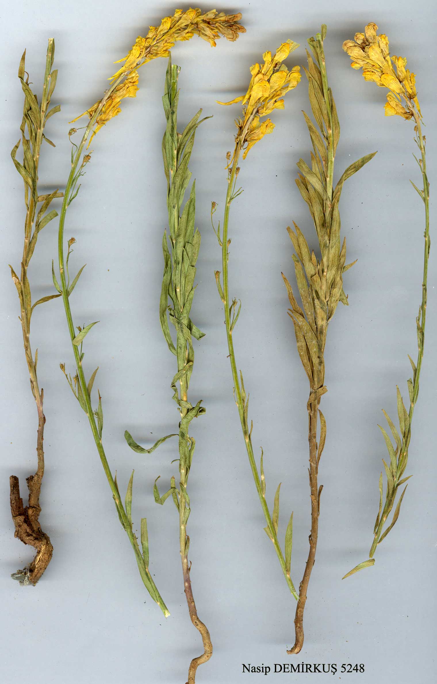 L. kurdica Boiss. & Hohen. in Boiss., Diagn. ser. 1 (4): 73 (1844). Erect perennial, 30-90 cm, very variable. Stems stout or slender, paniculate or simple, densely foliose. Median leaves ovate, lanceolate or linear, 30-60 x1-25 mm, very acute or pungent, not amplexicaul, 1-5-nerved, glaucous, thick. Racemes very dense, 5-12 cm in flower. Bracts lanceolate, usually longer than pedicels, often deflexed. Pedicels 1-2(3) mm in flower, slender. Calyx lobes 2-4 mm, ovate, oblong or lanceolate, obtuse to acute, membranous-margined, glabrous, pubescent, tomentellous, villous or ciliolate, eglandular or rarely glandular. Corolla bright or sometimes dirty yellow, with or without violet or brown veins, 8-13 mm, bilabiate to -y-way; spur 5-10 mm, directed downwards, straight or ± incurved. Capsule 4-6 mm, often ± puberulent above, longer than calyx. Seeds winged, 2-2.5 mm, disc minutely tuberculate. Fl. 7-8(-9). 1.Calyx lobes tomentellous or white-tomentose, always obtuse, 2-3 mm 2. Calyx crisply tomentellous (sometimes glandular), hairs not completely hiding the surface; corolla yellow, often violet-veined subsp. pycnophylla 2. Calyx densely white-tomentose, snowy white; corolla clear yellow subsp. eriocalyx 1. Calyx lobes glabrous, sparingly puberulent or only ciliolate, acute or obtuse, 2-4 mm 3. Median leaves linear to linear-lanceolate, only 1-4 mm broad, l(-3)-nerved; . corolla yellow, with or without violet veins subsp. araratica 3. Median leaves ovate elliptic to narrowly lanceolate, 7-20 mm broad, 3-5- nerved 4. Calyx lobes ovate to lanceolate, ± acute, 3-4 mm; corolla clear yellow and sometimes violet-veined subsp. kurdica 4. Calyx lobes ovate to ovate-oblong, obtuse, 2-3 mm; corolla dirty yellow (buff), often brown-veined subsp. aucheri subsp. araratica (Tzvelev) Davis in Notes R.B.G. Edinb. 36:8 (1978). Syn: L. araratica Tzvelev in Not. Syst. (Leningrad) 19:17 (1959)! L. lineolata sensu Grossh., Fl. Kavk. 7: map 536 (1967) non Boiss. Rocky mountain steppe. 1200-2700 m. Type: [Turkey B10 Kars] Turcia in monte Malyi Ararat [Küçük Ağri Da.], 14 viii 1919, Grossheim (holo. LE, photo E!). E. Anatolia. B9 Ağri: 32 km W. of Doğubayazit, 1210 m, Furse 3557! Bitlis: 4 km E. of Sarikum Köyü on road nr Ahlat, 1740 m. Buttler 15993! Van: nr Pişvanik, 18 km W. of Gevaş, 1750 m, D. 45996! C9 Hakkari: Cilo Da., gorge between Cilo Y. and Diz De., 2440 m, D. 24264! C10 Hakkari: Sat Da., N. of Sat G., 2700 m, Duncan & Tait 1 19 (stems branched), 1 18 (stems simple)! Soviet Armenia. N.W. Iran? Ir.-Tur. element. |