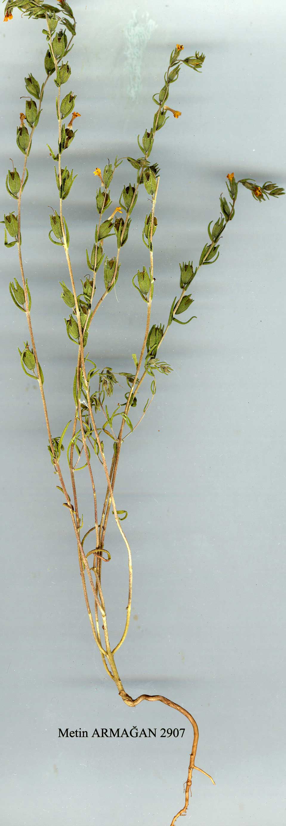 O. aucheri Boiss., Diagn. ser. 1(4): 74 (1844). Syn: Orthantha aucheri (Boiss.) Wettst. in Engler & Prantl, Nattürl. Pflanzenfam. 4<3b): 101 (1893). Figures 21, p. 655; 24, p. 771. Annual, eglandular-scabrid with short retrorse hairs. Stems erect, to 45 cm, little branched or with spreading-erect branches. Leaves linear to ovate-elliptic, variable in size, to 25 x 5 mm, usually much less, ± sessile, entire. Inflorescences lax; bracts leaf-like, longer than calyces. Pedicels c. 1.5 mm. Calyx tubular, 7-8 mm; teeth 3-3.5 mm, 2 slightly longer. Corolla golden yellow or yellowish-white, c. 9-12 mm, pilose; tube c. 5 mm. Anthers included, lacking mucro, glabrous. Capsule obovate, 9x5 mm, flattened and truncate-retuse, apiculate at apex; seeds c. 2.5 x 1.2 mm. Fl. 6-9. Limestone and metamorphic slopes, scrub, meadows, field-sides, 850-3050 m. Type: [Turkey B7 Erzincan] in Olympo (Keşiş Da.) Armeniae, Aucher 1693 (holo. G). Inner & S. Anatolia. A5 Amasya/Tokat: Evkere Da., between Amasya and Zile, Bornm. 1889:1250! A8 Gümüşane: Kop Da., Bayburt, 1680 m, Balls 1979! B2 Kütahya: Gediz, 850 m, D. 36956! B3 Afyon: Sultan Da., nr Çay, Bornm. 1899:5399. B4 Ankara: Karaca Da., Andrasovszky 653! B5 Kayseri: Ali Da., 1300 m, Bal. 1856:1029! B6 Maraş: Elbistan, W. of Nurihak Da., D. 20446! B7 Erzincan: Egin (Kemaliye), Sint. 1890:2855! B8 Erzurum: Hinis to Pasinler, 1900 m, D. 46336! B9 Ağri: E. side of Tahir pass, 2400 m, D. 47226! C2 Muğla: Çal Da., 35 km N. of Fethiye, 2170 m, Lambert & Thorp 580! C4 Konya: Bozkir, Belen Tepe, 1750 m, Çetik 1968: 102. C5 Niğde: Maden, Darrah 255! C6 Maraş: d. Maraş, Ahir Da., Haradj. 1741! C9 Hakkari: Zab gorge, 2-3 km below Hakkari, 1400 m, D. 45472! Lebanon, Anti-Lebanon, Soviet Armenia, Georgia, Iran (except S.). Ir.-Tur. element. |