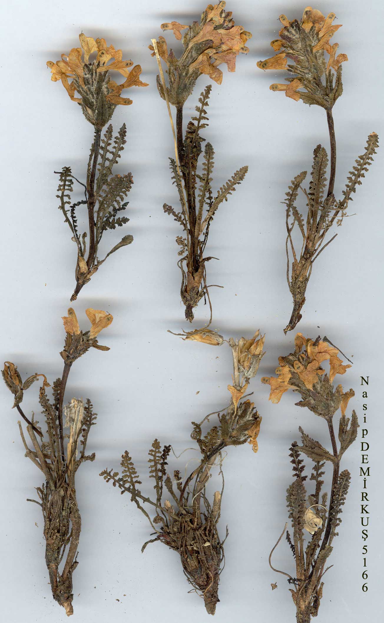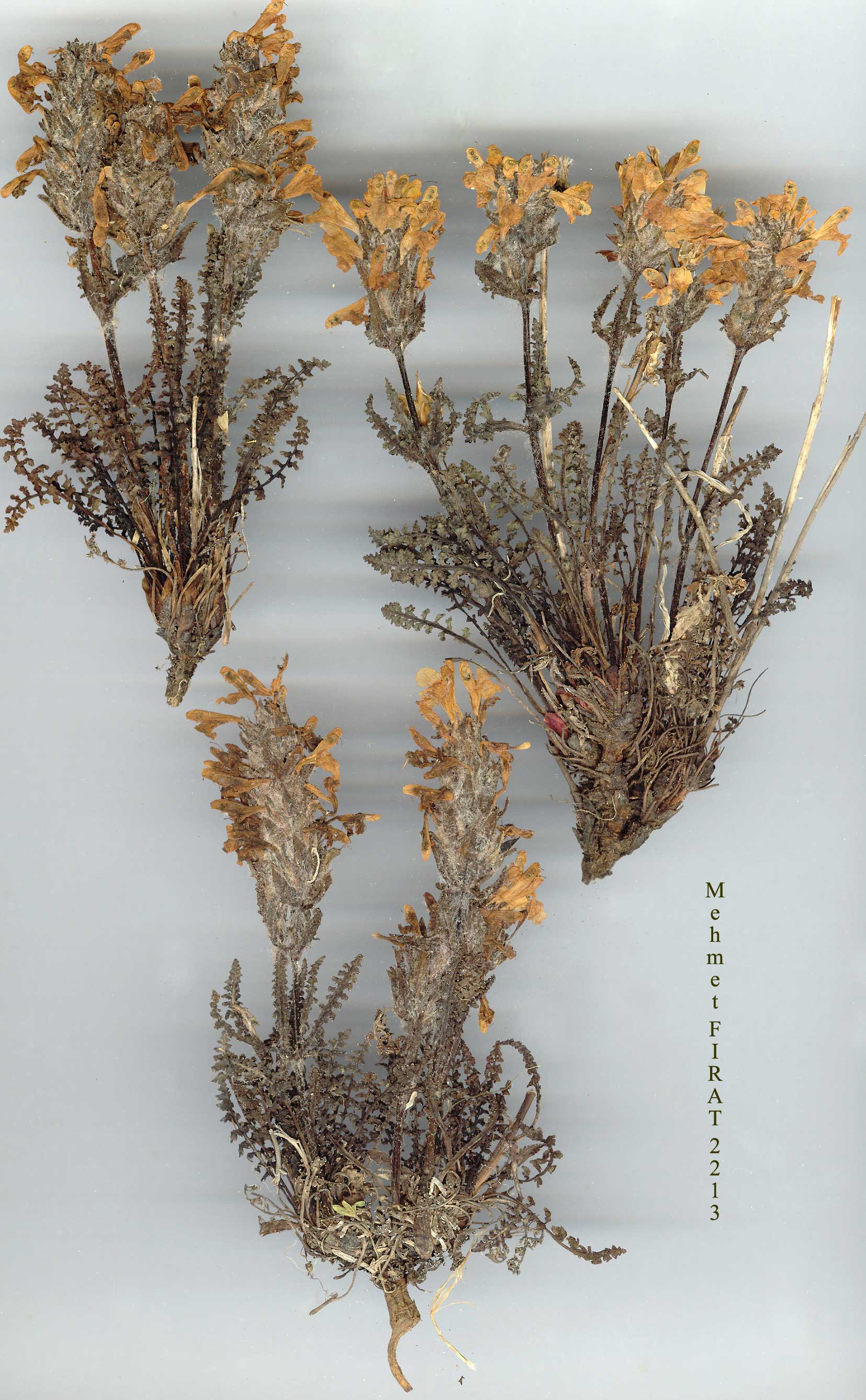 | P. caucasica Bieb., Fl. Taur.-Cauc. 2:72 (1808). Syn: P. armena Boiss. & Huet in Boiss., Diagn. ser. 2(3): 175 (1856)! P. caucasica Bieb. vars. albiflora Boiss., glabrescens Boiss. and apiculata Boiss., Fl. Or. 4:484 (1879). Ic: Mem. Soc. Nat. Mosc. 6:8 (1823). Figure 24, p. 771. Perennial. Stems 5-17 cm, erect, unbranched, eglandular-pubescent. Leaves narrowly oblong, 1-2-pinnatisect, 13-33x3-10 mm, serrate; basal with 1-3 cm petioles, cauline few, verticillate. Inflorescence a many-flowered, dense oblong lanate short spike. Bracts crenate to pinnatifid, 9-15 mm. Pedicels suberect, 1.5-4 mm. Calyx cylindrical, 6-11 mm; tube 4-6 mm; lobes 2-5 mm. Corolla white, pale yellow to pinkish on withering, 1 7-23 mm; tube 11-14 mm, cylindrical, bent near base; upper lip obtuse, ± straight. Anthers not mucronate; 2 filaments villous, 2 glabrous. Capsule oblong-lanceolate, 11-15 x 6-7 mm, glabrous, acute, oblique. Fl. 5-8. Alpine meadows, limestone and igneous grassy and rock) slopes, near melting snow, 2000-3660 m. Described from USSR, Caucasia: in Caucaso alpino orientali et iberico, Marschall von Bieberstein (LE). N.E. & E. Anatolia. A7 Giresun: Şebinkarahisar to Giresun, 2300 m, Stn. & Hend. 5828! Trabzon: between Zigana pass and Istavri köyü, 2350 m, A. & T. Baytop (ISTE 15349)! Gümüşane: Zigana pass, Sint. 1894:5583! A8 Gümüşane: Bayburt, Bourgeau. Erzurum: Kop Da. pass, 2300 m, Rix et al. 1707! Çoruh: S.E. of Artvin (Grossheim 7: map 610). A9 Kars: Kisir Da., 3000 m, D. 30556! B7 Erzincan: Sipikör Da., Sint. 1890:2138 ! B9 Erzurum: Tech Dagh (Palandöken Da.), Huet (type of P. armena Boiss.)! Van: Artos Da., 2900 m, D. 22724! Bitlis: Süphan Da., 3500 m, Frödin 181. Ağri: Tahir Da. pass, 2400 m, Rix et al. 1654! C9 Van: d. Çatak, Kavuşşahap Da., 3300 m, D. 23209! C10 Hakkari: Cilo Da., 10 km W. of Cilo Tepe, 3660 m, D. 24215! Caucasus, Georgia, Soviet Armenia, N. Iran. Hyrcano-Euxine (mt.) element. |