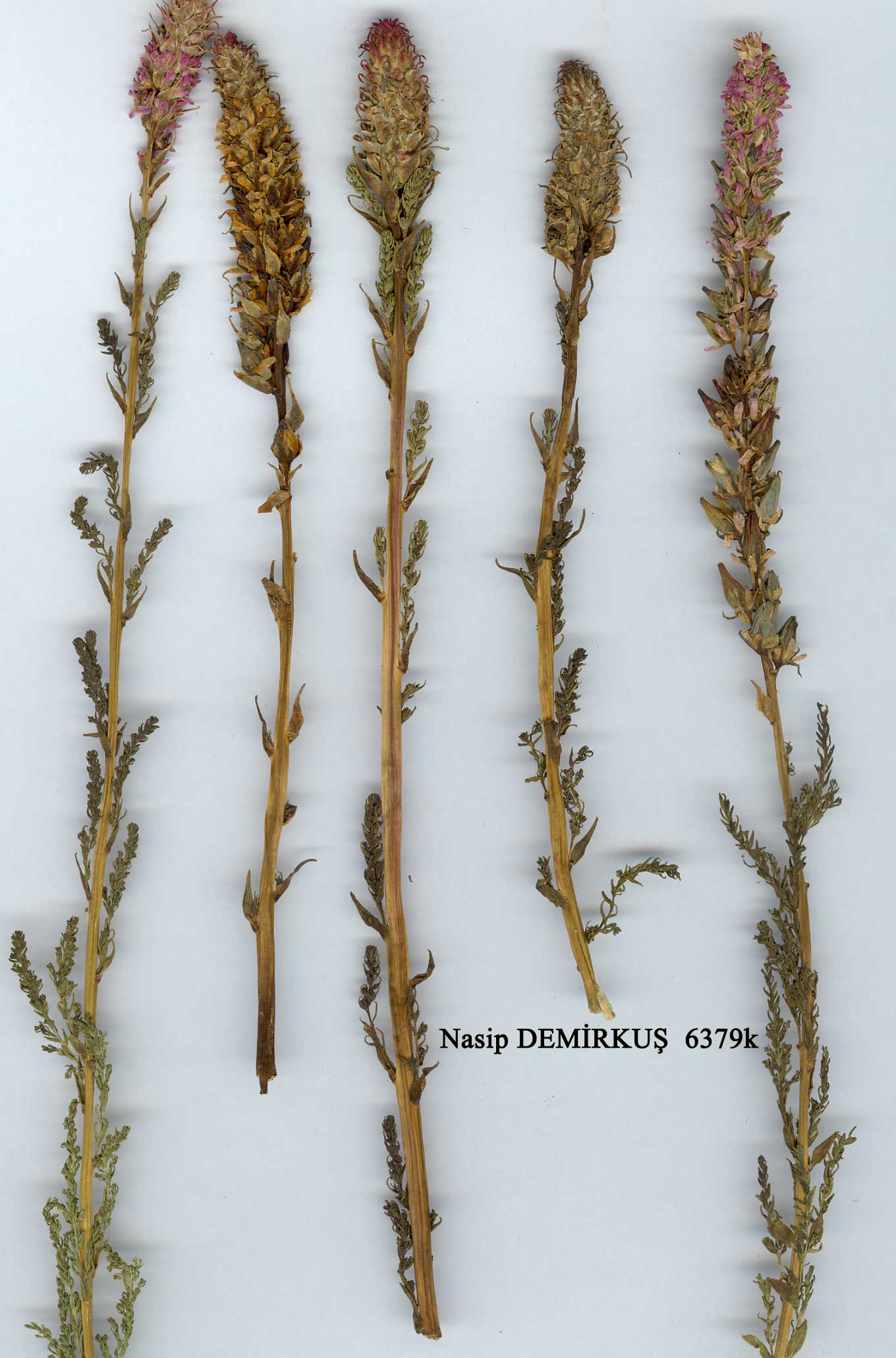 | M. germanica (L.) Desv. in Ann. Sci. Nat. 4: 349 (1825). Syn: Tamarix ger-manica L., Sp. PL 271 (1753); M. alopecuroides Schrenk in Fisch. & Mey., Enum. PI. Schrenk 65-66 (1841); M. squamosa Desv., op. cit. 350; M. armena Boiss., Fl. Or. 1: 763 (1867). Ic: Grossh., Fl. Kavk. 6: t. 32 (1962). Shrub up to 2 m. Leaves on the main shoots oblong-lanceolate, those on the lateral shoots linear to linear-oblong, scale-like, somewhat fleshy, green or glaucous. Racemes terminal or axillary, bracteate, dense, many-flowered, the lateral inflorescences often scaly at the base. Sepals lanceolate, greenish or reddish with scarious margins, 3.5-4.5(-6) mm. Petals pink, 4-6 mm. Petals and sepals persistent in fruit, much exceeded by the grey, flask-shaped, c. 10 mm capsules. Seeds fusiform with a prominent coma borne on a twisted stalk. Fl. 6-7. By streams, 800-2500 m. Described from Germany (Hb. Linn. 383/2!). A4 Kastamonu: Ilgaz Da., 1600 m, Bornm. 1890: 1736. A6 Ordu: Melet Irmak S of Ordu, Hand.-Mazz. A7 Gümüşane: Chromdere, Sint. 1894: 5862! A8 Trabzon: Of, Bal. 1454! A9 Kars: nr. Kağizman (Grossheim 6: map 207). B6 Sivas, 13 vi 1939, Reese. B7 Erzincan: Keşiş Da., 2500 m, D. 31696! B9 Van: 5 km N of Şatak, D. 23178! C5 Niğde: Çiftehan, 800 m, Siehe 1896: 490! S. & C. Europe, Caucasia, Iran, Afghanistan, W. Pakistan. A very variable species, much divided by earlier workers. The characters used show little correlation. |
