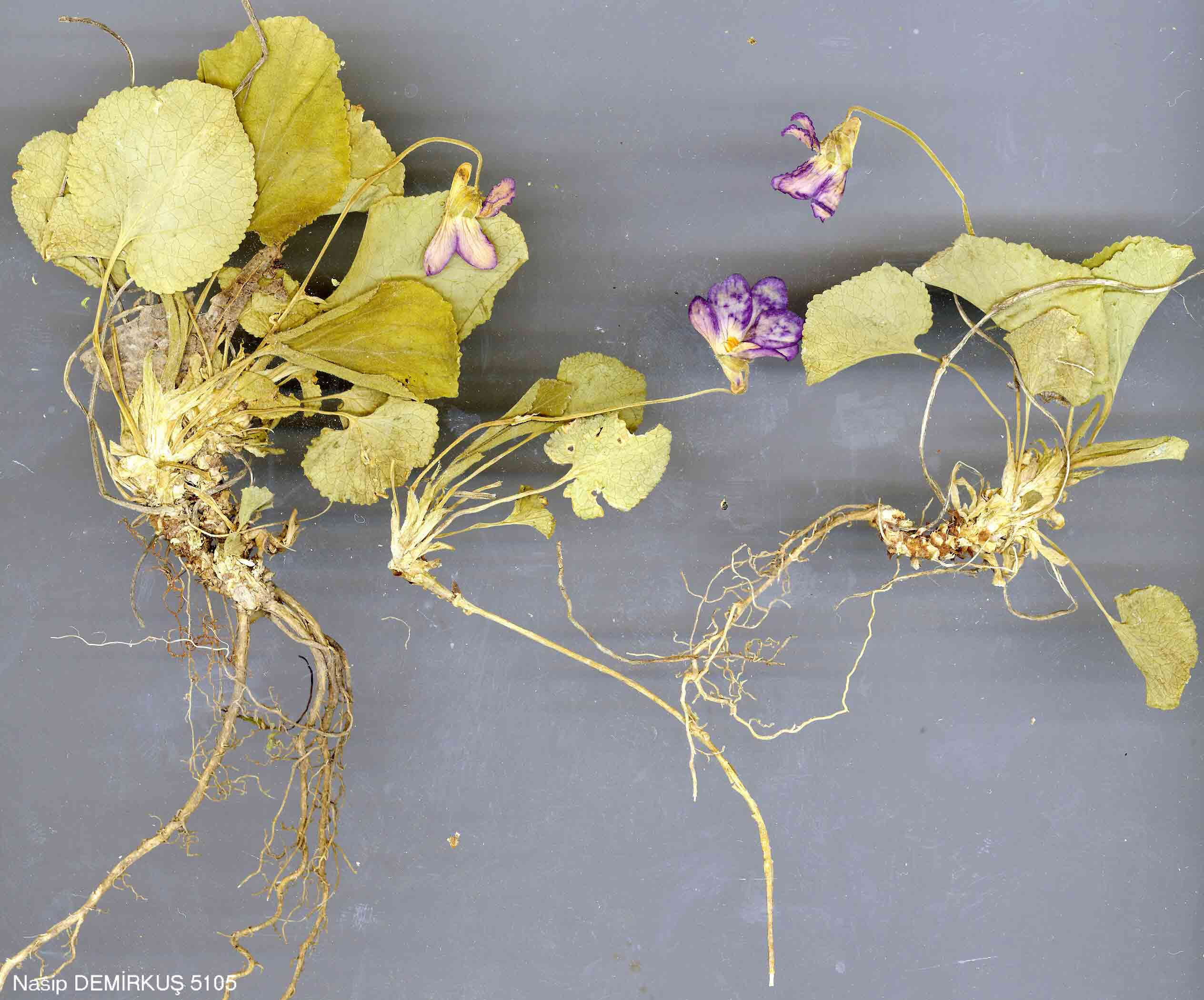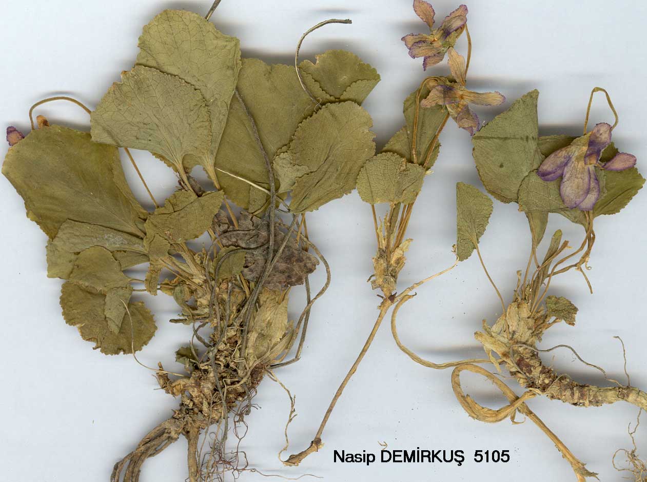 | V. odorata L., Sp. PI. 934 (1753). Syn: V. wiedemannii Boiss., Fl. Or. 1: 457 (1867). Ic: Ross-Craig, Draw. Brit. PL 4: t. 7 (1950).Acaulous perennial herb, 3-12 cm, with long overground stolons rooting at their ends. Stipules broadly lanceolate, glandular-fimbriate. Petioles with an indu-mentum of short deflexed hairs. Leaves ovate-orbicular, obtuse, cordate at the base, crenate, ± glabrous. Flowers fragrant, purple, the lower petal 11-16 mm. Capsules lying on the ground when ripe. Fl. 4-5. Often in shady places, s.L-1600 m. |
