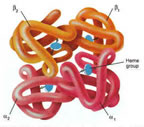 | 1-Eritrositlerin, oksijen ve karbondioksit ileten ve pH ayarlanmasında yardımcı olan, kırmızı renkte demir içeren protein pigmenti. 2-Alyuvarlar içerisinde bulunan ve yapısında demir taşıyan, kırmızı renkli bir solunum pigmenti. 3-Alyuvarlarda O2 ve CO2 taşıyan, demir içeren protein. 4-Hemoglobin;alfa.beta zincirleri, magnezyum iyonları ve hem molkülünden oluşmuştır. |