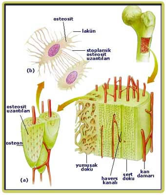 Kemik dokusu, insan ve omurgalı hayvanların iskeletini oluşturan dokudur. Bu doku, canlı kemik hücreleri ile bu hücreleri salgıladığı ara maddeden oluşur. Kemik hücrelerine osteosit, ara maddeye ise osein denir. Kemik hücreleri çok sayıda sitoplazmik uzantılara sahiptir. Ara. maddelerin çoğunu protein yapısındaki kollegen bağ dokusu lifleri oluşturur. Bu liflerin arasında magnezyum, fosfat, kalsiyum karbonat, kalsiyum.florür gibi inorganik tuzlar birikerek kemik dokusunu sertleştirirler. Kemik dokusu sıkı ve süngerimsi yapıda olmak üzere iki kısımdır. |
