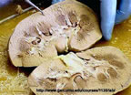 2-Böbrek boyuna kesildiğinde, böbreğin iki kısımdan oluştuğu görülür. Dışta, kabuk (korteks) ve bunun altında yer alan öz (medulla) bölgesi bulunur. Böbreğin tam ortasında havuzcuk vardır. Havuzcuktan çıkan idrar kanalı (üreter), idrar kesesine bağlanır .