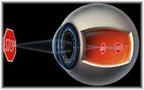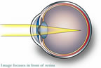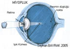 1-Göz yuvarlağı basıklaşmıştır. Bu basıklıktan dolayı gözün boyu uzadığı için görüntü retinanın önünde teşekkül eder. Böyle kişiler yakını iyi görüp, uzağı iyi göremezler. Kalın kenarlı merceklerle miyopluk düzeltilir. 2-Yakını görürlük. Göz yuvarlığı aşırı derecede uzamış ve retina, merceğin fazla uzağında kalmıştır. Işık ışınları retinanın önündeki bir noktada birleşip yeniden ayrılarak retinaya ulaştığından bulanık görüntü meydana gelir Örnek:hipermetrobun tersi. |