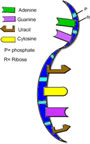 Nukleusta sentez edilip sitoplazmadaki ribozomlara geçen özel bir RNA çeşididir. Ribozomlardaki RNA ile birleşir ve bir enzim ya da diğer bazı özel protein sentezleri için kalıp görevi yapar. (elçi RNA, haberci RNA) mesajcı RNA vücudun gereksinimlerine yada organizmanın gereksinimlerine DNA nın tepki şifrelerini taşıyan DNA zinciri üzerinde sentezlenen RNA dır.Ve aldığı mesaj sitoplazmada uygulamaya konularak vücudun gereksinimlerini karşılar. Örnek:DNA daki şifreleri gerekli yerlere iletilmesini m-RNA sağlar. |