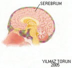 1-Omurgalılarda kafatasının üst kısmını işgal eden beynin ana kısmıdır. İnsanda iki beyin yarım küresi Corpus callosum’la birleşerek merkezi sinir sisteminin en kısmını oluşturur. 2-Beyin:Milyarlarca nörondan oluşan beyin, sinir sisteminin merkezidir. Omurgalılardaki beynin temel yapısı birbirine benzer. Beyin dıştan içe doğru, sert zar, örümceksi zar ve ince zar denilen üç zarla örtülüdür. İnce zarda bulunan kan damaları beynin beslenmesini sağlar. Omurilikteki zar yapısı da aynı beyindeki gibidir. Örümceksi zar ile ince zar arasında, beyin ve omuriliği şiddetli sarsıntılardan koruyan serebrospinal sıvı bulunur. Beyin, ön-orta-arka beyin olmak üzere üç kısımda incelenir. |