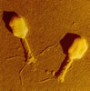 | T4 bakteri virüsü.Morfolojik ve genetik olarak T2 ve T4 virüsuna benzeyen, 120 milyon molekül ağırlığına ve 166000 baz çiftlik çift heliks DNA'ya sahip, bir baş, başa boyunla bağlı bir kuyruk ve kuyruğa bağlı altı telden oluşan kuyruk tellerinin bulunduğu bir kaide kısmı ekli olan, başta DNA molekülünün çevresini 80000 molekül ağırlığında protein birimleri çeviren bir bakteri virüsü. |
