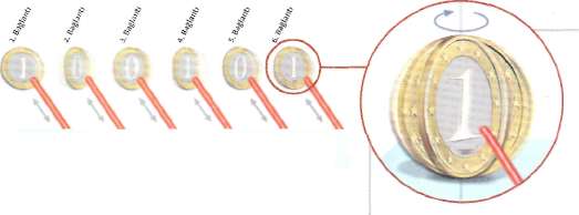 KUVANTUM FİZİĞİ: Kendi etrafında dönen bir sikke gibi, kuvantumbit'ler İzlenilmeyen bir durumda sürekli olarak 0 ve 1 değerlerini alıp dururlar. Ancak, mesela bir lazer ışının sorgusunda,önceden programlanmış sorunun sonucu tespit edilir.