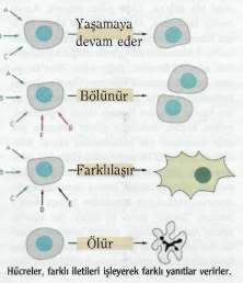 züyle bakılabilir. Küçük moleküllerin almaçlarla birleşmesi, almaçların şeklinin değişmesine ya da diğer almaçlarla kümeleşmelerine neden oluyor. Bu, hücre içinde bir dizi protein etkileşimini başlatıyor. Kimi anahtar enzimler ya da yazılım proteinleri etkin hale geliyor ya da etkinlikleri sona eriyor. Yani iletilere yeşil ya da kırmızı ışık yakılıyor. Enzimlerin ya da yazılım proteinlerinin etkin hale gelmesiyle, kimi genler de et-kinleşiyor ve bazı proteinlerin üretimi başlatılıyor. Bu da genlerde bulunan yapısal ya da işlevsel bilgilerin harekete geçirilmesi demek. Hücre, aldığı iletiye göre davranıyor; bölünüyor, farklılaşı yor ya da ölüyor. Gerçekte, hücreler sü rekli yüzlerce farklı iletinin bombardı manı altında, durmaksızın çevrelerine tepki vermeye ve uyum sağlamaya çalı şıyorlar.
