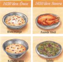 Eğer İngiltere ya da Fransa'da bir 16. yüzyıl saray ziyafetine katılacak olsaydık, önümüze gelen yemekleri yadırgayacağımız kesin gibi. Ana yemeklerin arasında bulunacaklardan biri, olasılıkla "blancmange" (öğütülmüş bademin sütüyle nemlendirilmiş, üzerine şeker serpilmiş ve kızarmış domuz yağı dökülmüş koyu bir tavuk-pirinç püresi). Sonra fırınlanmış süt domuzu, yanında da kamelin sosu (ekmek kırıkları, öğütülmüş kuru üzüm ve bademle koyu kıvama getirilmiş, tarçın ve karanfille baharatlandırılmış ekşi üzüm suyu). Belki yanında etsuyuyla pişmiş ve üzerine tatlı ayva macunu sürülmüş bakla, ve tabii içecek olarak da, zencefil, tarçın ve karanfille baharatlandırıl-mış, tatlı bir kırmızı şarap olan "hypoc-ras". Ancak filmi bir 100 yıl kadar ileri sararsak, bu ziyafet sofrasında tanıdık gelecek bazı şeyler bulmak mümkün olabilir: Etsuyu çorbası, istiridye, ançuez, fırınlanmış, soslu hindi. Garnitür olarak kremalı mantar; salata olarak zeytinyağı-sirke soslu bir yeşil salata; limon şerbetiyle servis edilen taze meyveler ve beyaz şarap.