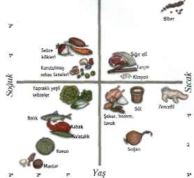 olan tuz. (Cıva ve kükürt, bugün bu adlar-la bildiğimiz elementleri temsil etmiyor; tuzla kastedilense, yine bildiğimiz sofra tuzu değil.) Buna bağlı olarak cıva, kokunun; kükürt, nem ve tatlı tadın (aynı zamanda diğer iki elementi de birbirine bağlıyordu); tuz da genel olarak tat ve kıvamın belirleyicisi ve temsilcisiydi. Hekimlerse sindirimdeki temel etkinliğin pişirmeden çok mayalanma olduğu görüşündeydiler. Asitli mide sıvıları yiyeceği beyaz, sütümsü bir sıvıya dönüştürüyor, bu da sindirim kanalında alkali niteliğindeki safrayla karışıyor, karışım mayalanıp köpürerek, vücudun kan ve diğer sıvılara dönüştürebileceği tuzlu bir madde üretiyordu.