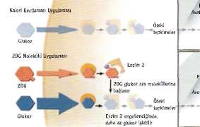 Maymunlardan alman olumlu sonuçlarla kalori kısıtlamasının iyice peşine düşen araştırmacılar, hücrenin metabolizmasındaki değişimleri incelemeye karar vermişler. Metabolizmadan, kandaki glukozun hücreye alınması ve bunun hücresel etkinlikler için kullanılabilir yakıta çevrilmesi anlaşılmalı. Bu durumda, kalori kısıtlamasıyla hücre içine daha az glukoz alınacak. Bu da daha az yakıt demek. Acaba, hücre işlevleri bundan nasıl etkilenecek? Soru bu... Bu noktada birkaç biyoloji bilgisini hatırlamak gerekiyor. Besinlerimizdeki karbonhidratların parçalanmasıyla elde edilen glukozun, hücrelere girişini sağlayan kapı, İnsülin hormonu var. Yemek yedikten sonra kandaki glukoz oranı artarken bu hormon salgılanıyor. Glukoz hücreye girdikten sonra, sitoplazmada enzimler aracılığıyla işleniyor ve sonra hücrenin enerji üretimiyle ilgili bi-rimi olan mitokondride, hücresel etkinliklerde kullanılan yakıt olan ATP (adenozintrifosfat) molekülüne çevriliyor. İşte, uzun yıllardır kalori kısıtlaması uygulamasıyla uğraşan, Mark Lane, Donald Ingram ve Geor-ge Roth, hücre metabolizmasındaki tüm bu olayları gözden geçirirken, literatürde bir molekülle karşılaşmışlar: 2-de-oksi-D-glukoz (2DG). Bu molekül, 1940-1950'li yıllarda kanser araştırmala-