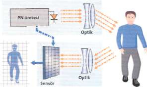 İLKE: PMD chip'i yarasalarınkinden farklı olarak, sesle değil ışık içtepileriyle çalışıyor. Bir vericiden gönderilen modüle edilmiş ışık sinyali, sözgelimi görünmez kızılötesi ışık, ölçülecek sahneyi aydınlatıyor. Nesneden (grafikte bir yayadan) yansıyan ışık, PMD algılayıcısındaki piksel elemanlarına isabet ediyor. Algılayıcı modülasyon kaynağına bağlı olduğu için yansımaları çıkış sinyalleri ile karşılaştırabiliyor. Yansıyan ışığın gidiş süresi yoluyla, nesnenin uzaklığı piksel piksel ortaya çıkıyor.