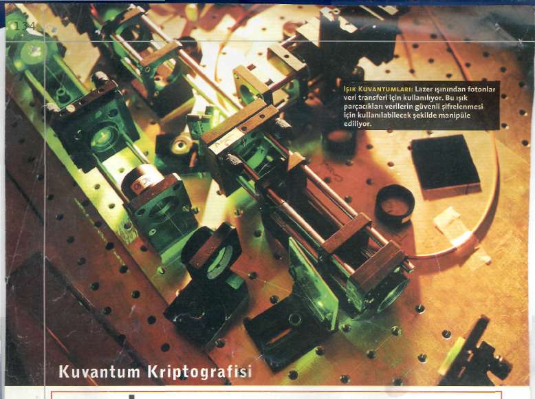 hemen bütün anahtarlar çözülüyordu. Ama casusların işi giderek zorlaşıyor. Kuvantum kriptografisi gizli anahtarları (şifreleri) koruyacak. Buradaki hile her bir dinleme denemesinin derhal göze çarpması. Bunun anlamını kavramak için ardında yatan teorik bilgiyi tanımak gerekiyor. Kuvantum kriptografisi ilkesi ışığın yalnızca dalga özelliklerine değil, aksine parçacık Özelliklerine de sahip olmasına dayanıyor. Bu tip bir ışık parçacığının (foton) ku-tuplandırılması yatay, dikey, sola doğru eğik ya da sağa doğru eğik yönelimli olabiliyor. Bu farklılık olanağını ku-vantum araştırmacıları cam elyaf üzerinden anahtarların transferinde kullanıyor (bkz. yan sayfadaki kutu).