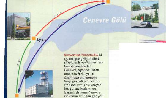 olan 67,1 kilometreye çekmiş bulunuyorlar. Gregoire Ribordy Şubat ayında kuvantum teçhizatım bu uzaklığa ayarladığında, Cenevre Gölü'nün Öteki ucundan cam elyaf içinde çok düşük bir lazer içtepisi kaydetmişti. Dört dakika sonra Lozan'da dünya üzerinde gönderenden başka hiçbir kimsenin tanımadığı bir anahtarın yaklaşık 13.000 bit'ini elde etmişti. USB bağlantılı ve ağ prizli paket üzerinde aslında "Quantumkryptography inside" yazmalıydı. "Ben kuvantum şifreleme demeyi tercih ediyorum" diyerek Ribordy alçakgönüllülük ediyor; o Cenevreli üretici id Quantique'in yöneticilerinden biri.