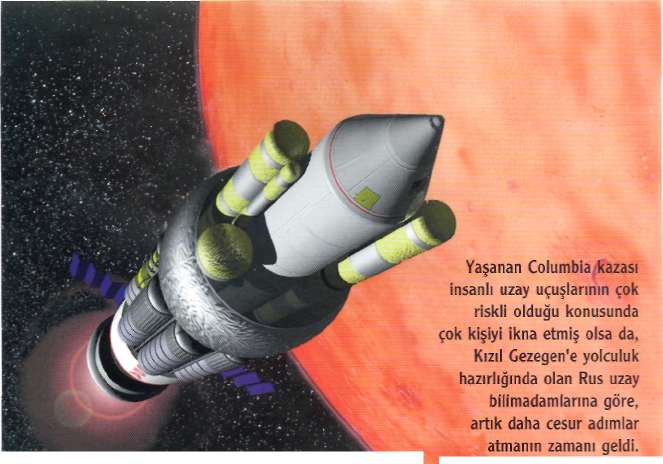 nik sorunlar, daha da iddialı bir girişim için cesaret verici işaretler değil. Yine de Rusya'nın belli başlı tüm uzay enstitüleriyle roket tasarım merkezlerinde görevli uzmanlar, Mars'a insanlı bir uçuşun planlanmasına katılıyorlar ve seferin başlangıcı İçin ge-çici bir tarih bile belirlemiş bulunuyorlar: 8 Mayıs 2008. Rusya'nın insanlı uzay araçlarının çoğunu ve Mir uzay istasyonunu yapan Energia şirketinden. ''Mars'a İnsan" fanatiği Le-onid Gorshkov, planlama çalışmalarında oldukça önemli aşamalar kaydettiklerini belirtiyor.