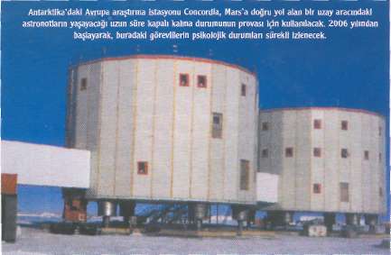 ESA'nın 2006'da başlatmayı plan-ladığı bir araştırma programının mü-dürü Oliver Angerer Dünya üzerinde en izole yerlerden biri olan Concor-dia'nın, Mars'a yapılacak bir görevde yaşanması olası durumların İleri dü-zeyde provasına olanak tanıyacağını vurguluyor. Tıpkı uzun süreli bir uzay yolculuğunda olduğu gibi, Con-cordia'daki görevlilere 9 ay boyunca herhangi bir kurtarma ekibinin ulaş-tırılması mümkün değil. İstasyon aynı zamanda, İnsanlı bir uzay görevine yönelik olarak gerçekleştirilecek tıbbi gözlemler için de test ortamı olarak kullanılacak.